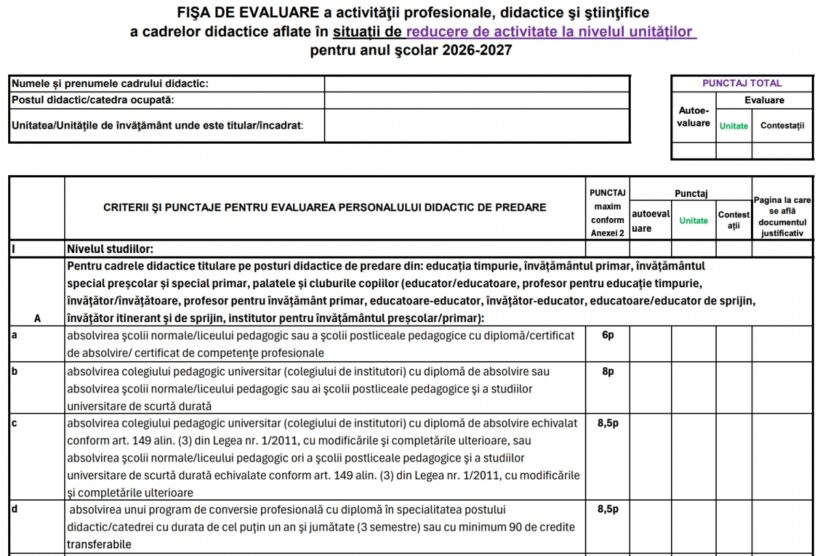 Inspectoratul Școlar Județean Neamț a publicat fișa de evaluare a profesorilor aflați în reducere de activitate pentru anul școlar 2026-2027. Fișa a fost realizată în conformitate cu prevederile din metodologia-cadru de mobilitate pentru anul școlar 2026-2027. Vezi mai jos, în articol, cum se acordă punctajul în funcție de studiile profesorilor.