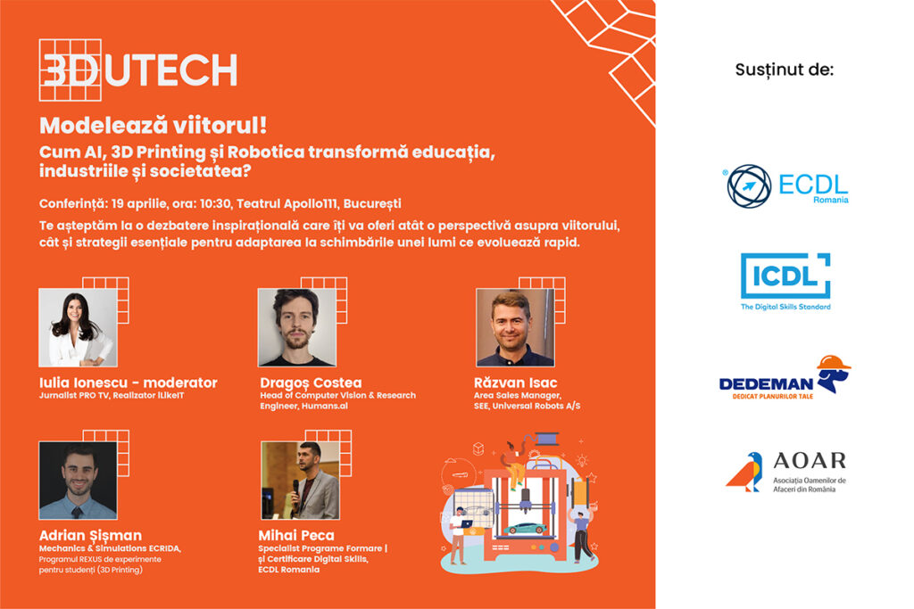 „Modelează viitorul!” este invitația lansată de 3DUTECH pentru evenimentul care va avea loc pe 19 Aprilie la Teatrul Apollo111, moderat de Iulia Ionescu, realizatoarea emisiunii iLikeIT de la PRO TV. Pasionații de tehnologie și inovație vor avea ocazia să exploreze noile direcții și provocări aduse de inteligența artificială, imprimarea 3D și robotică în diferite domenii ale societății.