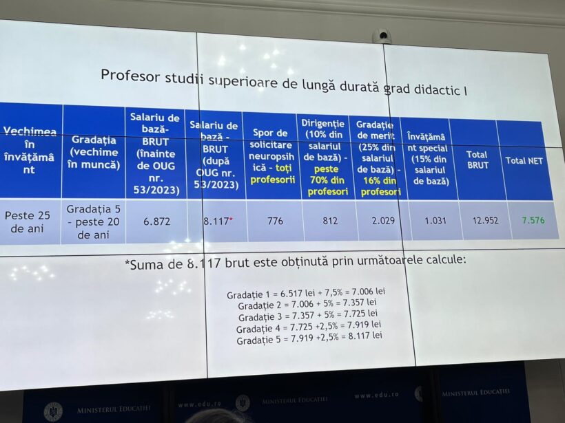Pentru un debutant, „salariul de bază brut înainte de ordonanța de urgență nr. 53 este 4.098. Salariul de bază brut după ordonanță este fix cu 1.000 lei mai mult, 5098; sporul de solicitare neuropsihică – 307 lei, cu o eventuală dirigenție încă 509 lei; total brut – 5.914; total net 3.430.”