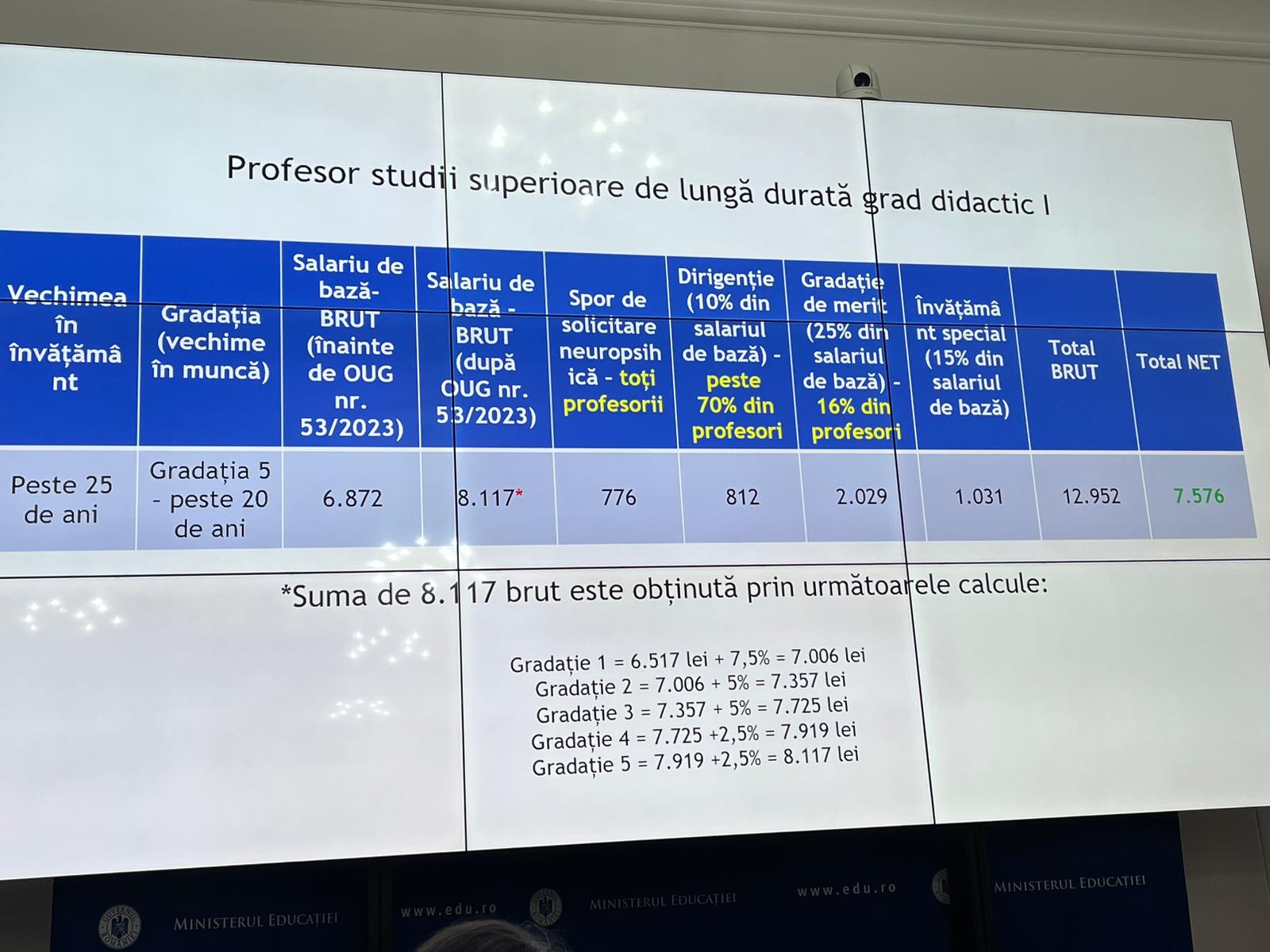 La acest brut se adaugă: sporul de solicitare neuropsihică acordat tuturor profesorilor, care înseamnă 776 lei; dirigenția – 70% dintre profesori au și sporul de dirigenție, care ar însemna încă 812 lei; gradația de merit – dacă se află între acei 16% dintre profesori care au această bonificație, ar mai însemna încă 2.029 lei; și eventual învățământul special – în jur de 1.000 lei; Total brut, pentru un profesor, grad I, care ar avea toate aceste bonificații, ar însemna 12.952 lei, un net de 7.576”, a precizat ministrul Educației.