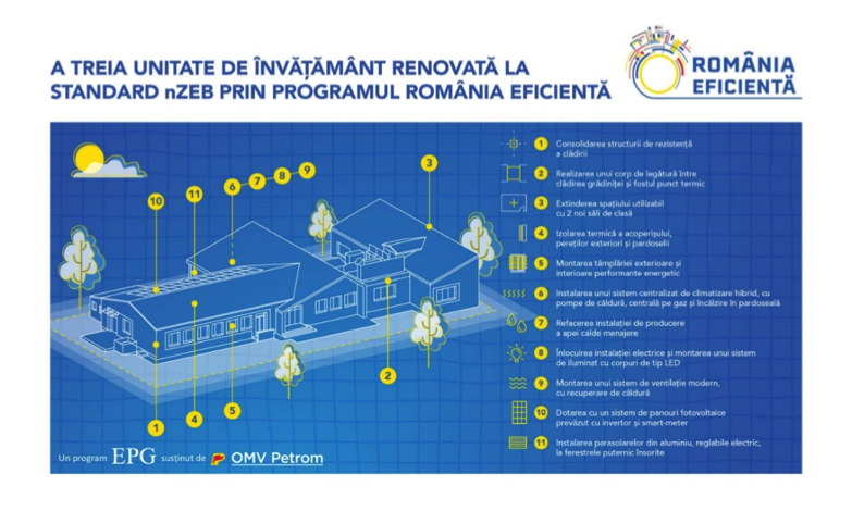 Datorită unei investiții de aproximativ 1,5 milioane de euro, susținută de OMV Petrom prin programul România Eficientă, derulat de Energy Policy Group (EPG), Grădinița Zig-Zag din localitatea Ovidiu, județul Constanța, beneficiază acum de o clădire consolidată structural, renovată energetic la standard nZEB, și de un spațiu mai generos, prin amenajarea a două săli de clasă suplimentare.
