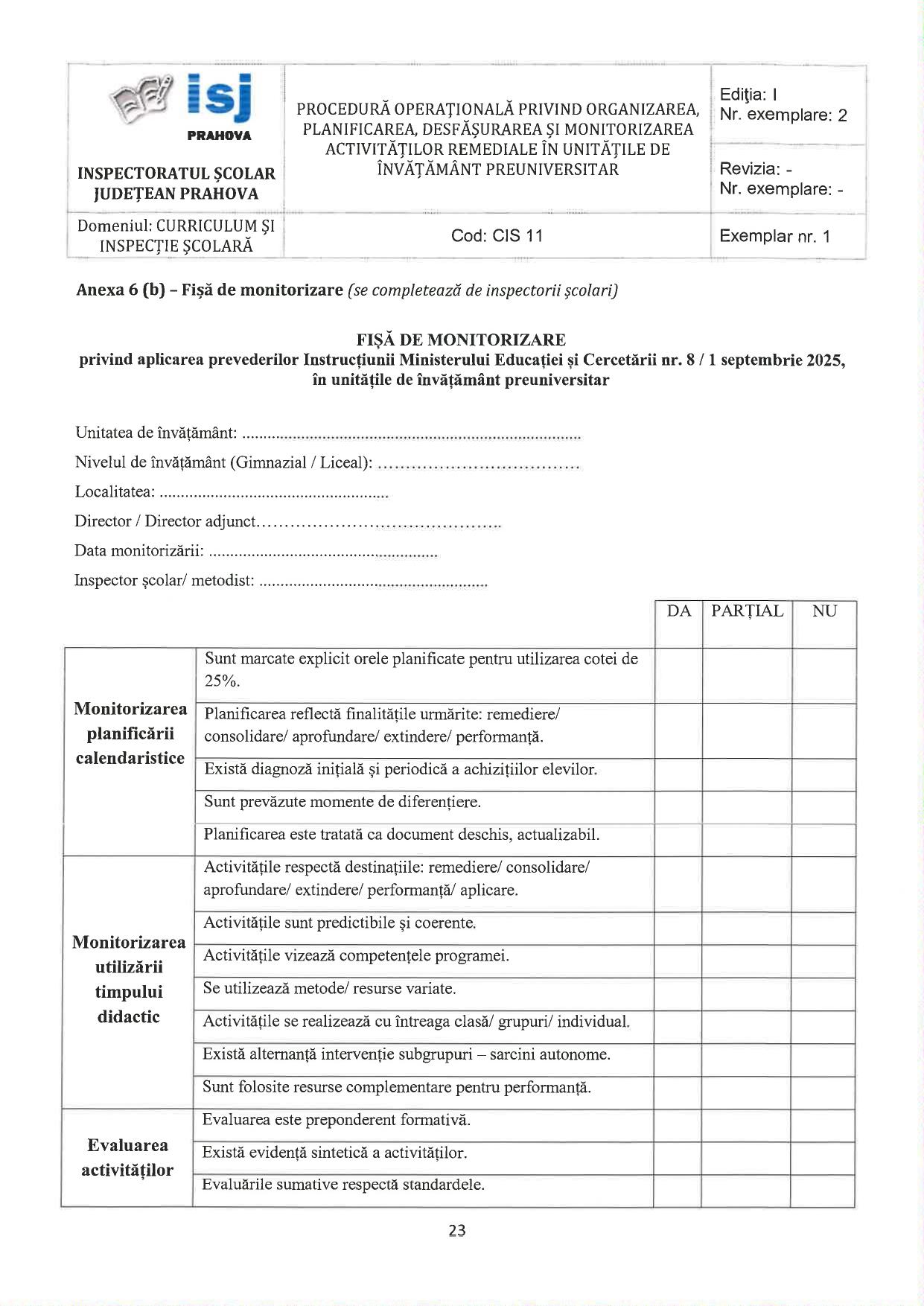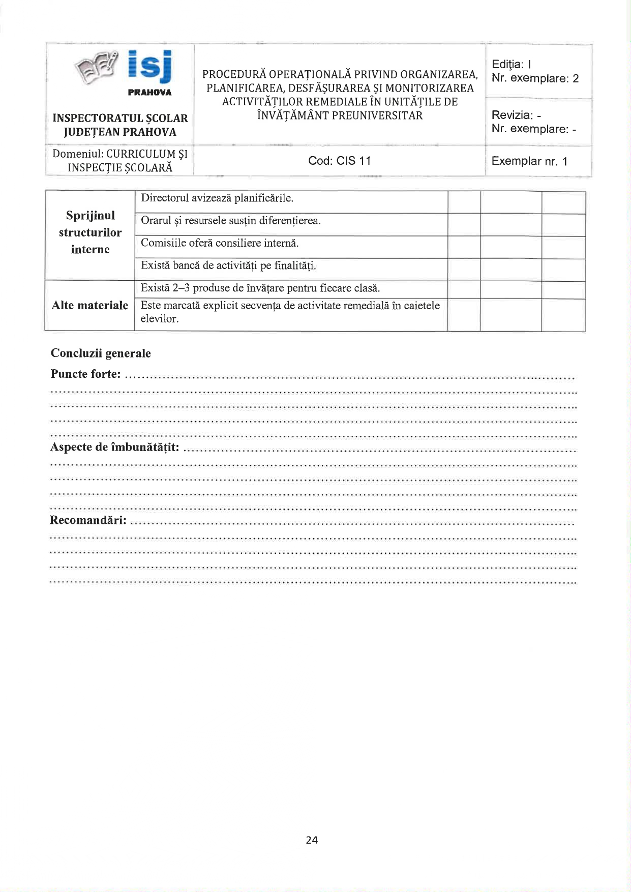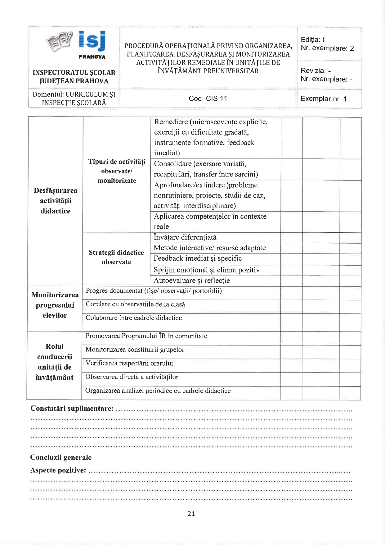 Inspectoratul Școlar Județean Prahova a publicat procedura operațională privind organizarea, planificarea, desfășurarea și monitorizarea activităților remediale în unitățile de învățământ preuniversitar. Este vorba despre cele 2 ore pe care toți învățătorii le au incluse în atribuțiile postului, precum timpul de 25% aflat la dispoziția profesorilor de gimnaziu și de liceu. Vezi mai jos fișele de monitorizare pentru învățători și profesori.