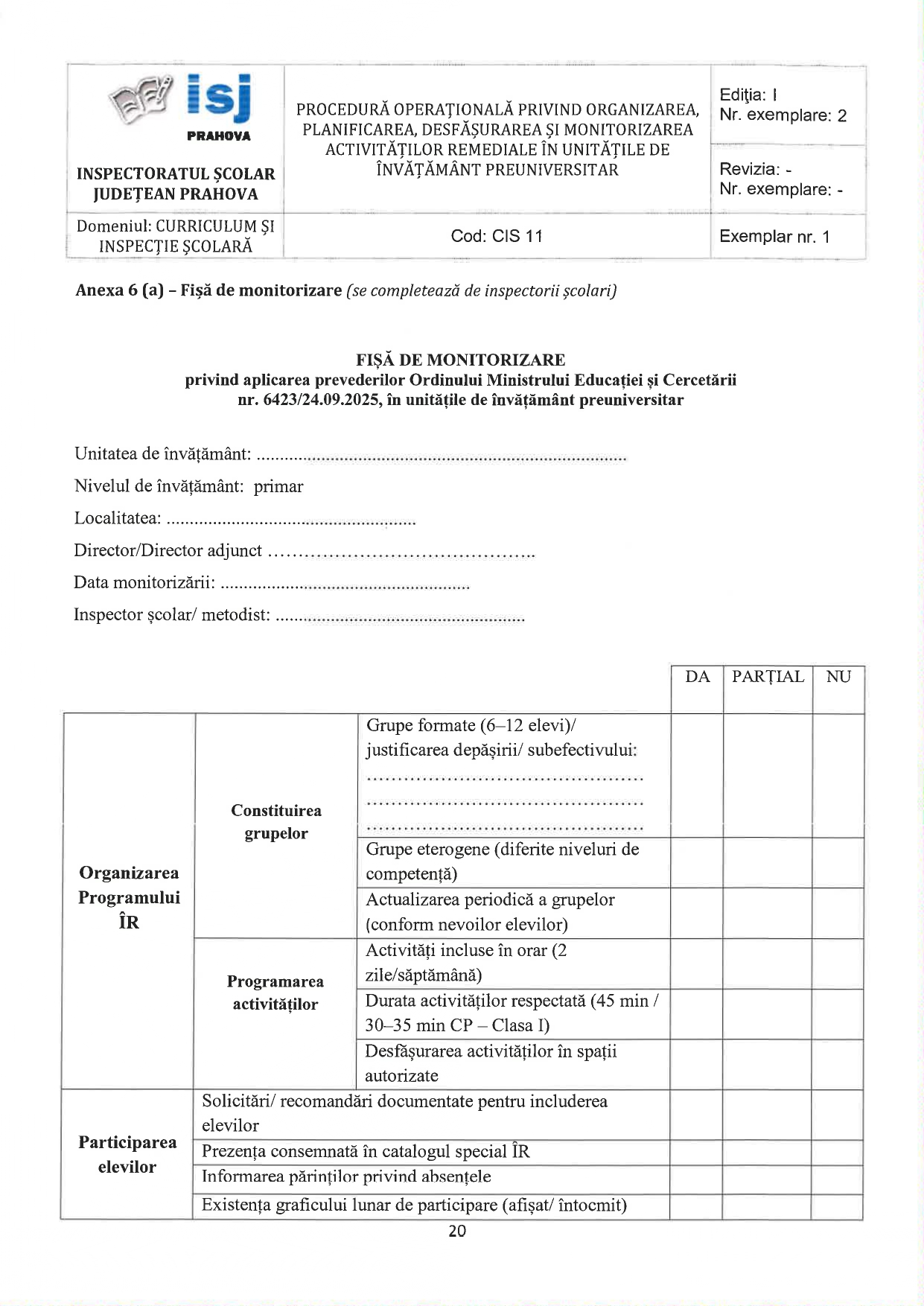 Fișa pentru învățământul primar cuprinde informații despre constituirea grupelor, programarea activităților, participarea elevilor, desfășurarea activității didactice, monitorizarea progresului elevilor, rolul conducerii unității de învățământ.