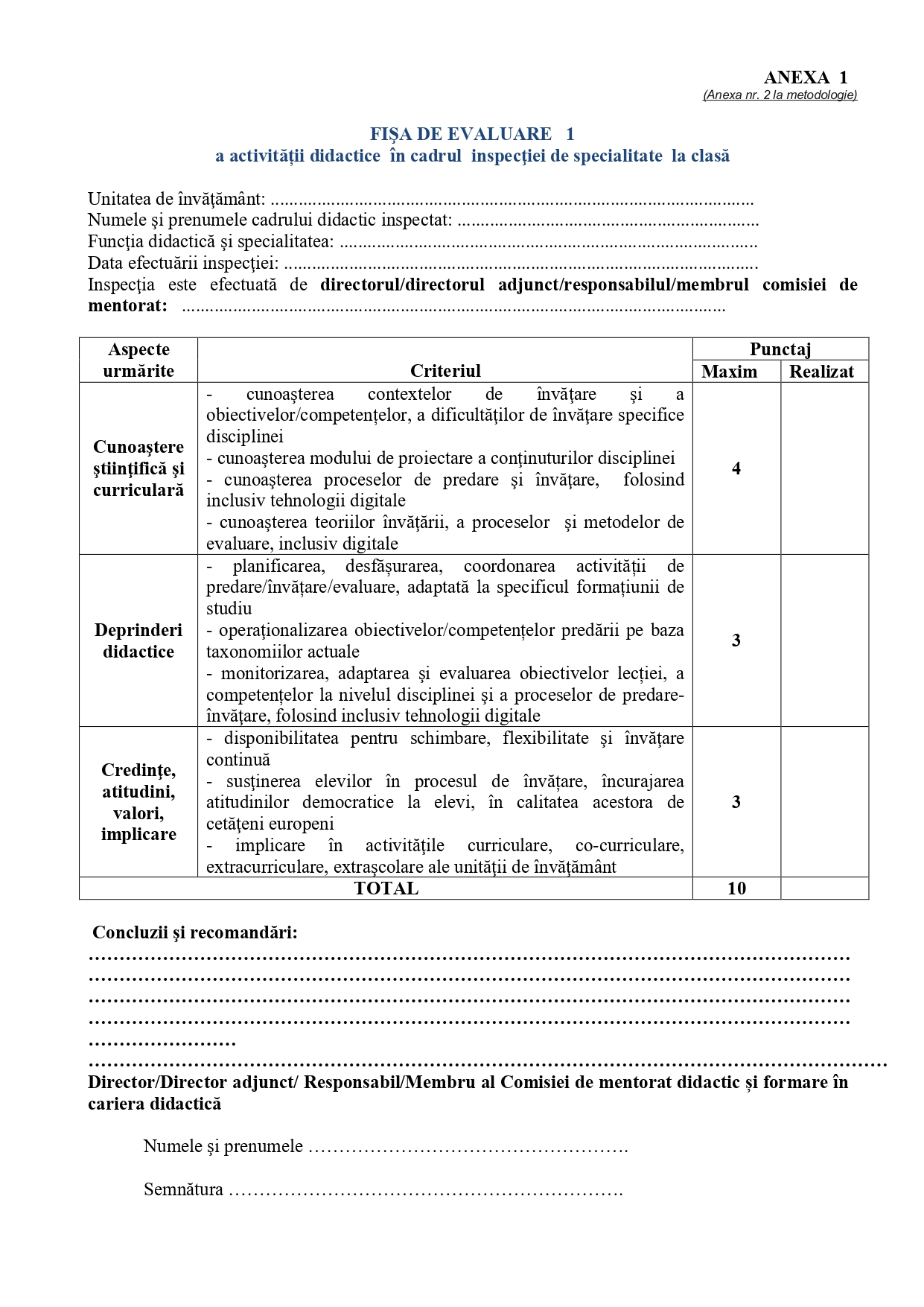 Fișa de evaluare 1 a activității didactice în cadrul inspecției de specialitate la clasă – Definitivat, sesiunea 2026