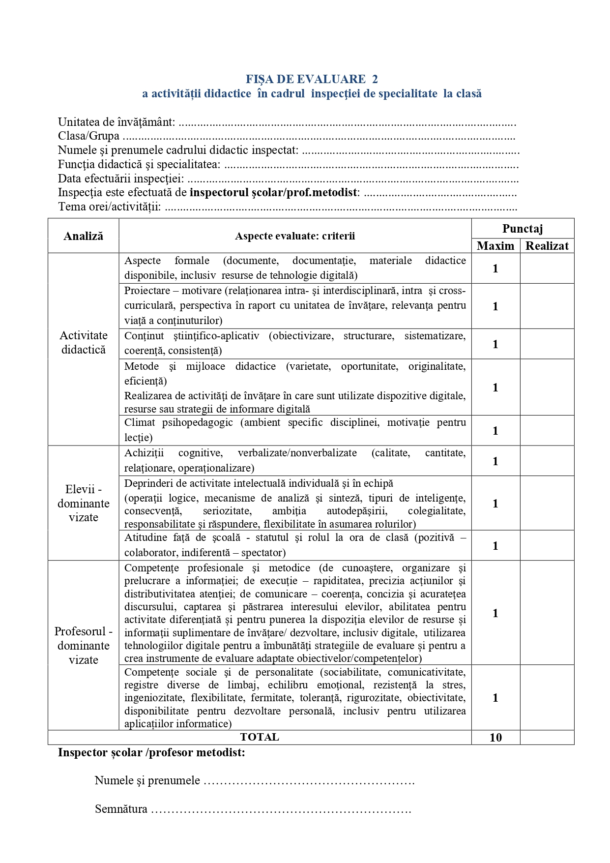 Fișa de evaluare 2 a activității didactice în cadrul inspecției de specialitate la clasă – Definitivat, sesiunea 2026