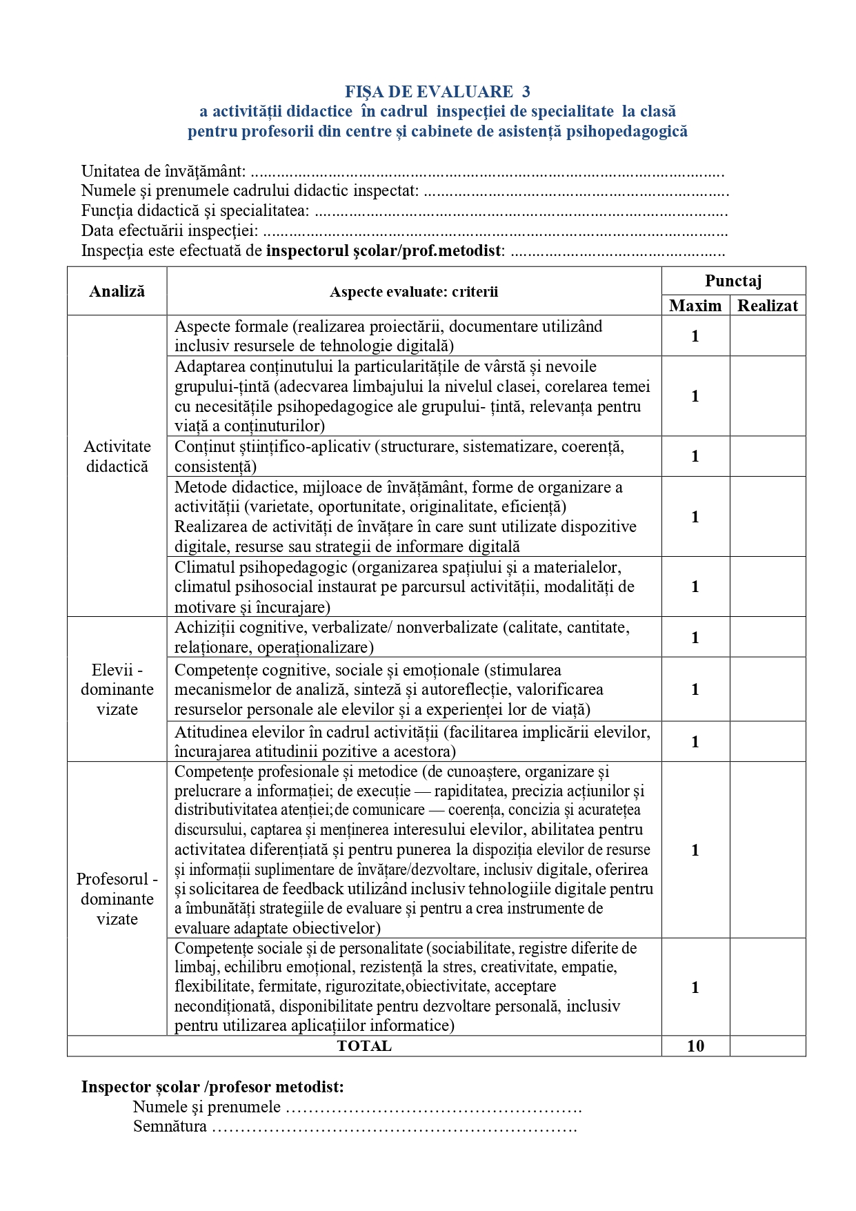Fișa de evaluare 3 a activității didactice în cadrul inspecției de specialitate la clasă pentru profesorii din centre și cabinete de asistență psihopedagogică – Definitivat, sesiunea 2026