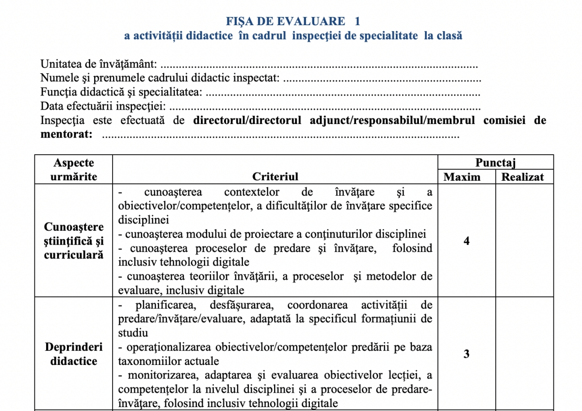 Fișa de evaluare 1 a activității didactice în cadrul inspecției de specialitate la clasă – Definitivat, sesiunea 2026