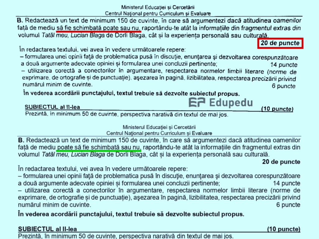 În varianta oficială publicată de Ministerul Educației și Cercetării pe site-ul subiecte.edu.ro, cerința apare corect formulată: candidații să argumenteze „dacă atitudinea față de mediu poate să fie schimbată sau nu”, raportat atât la fragmentul din textul dat – „Tatăl meu, Lucian Blaga” de Dorli Blaga -, cât și la experiența personală sau culturală.
