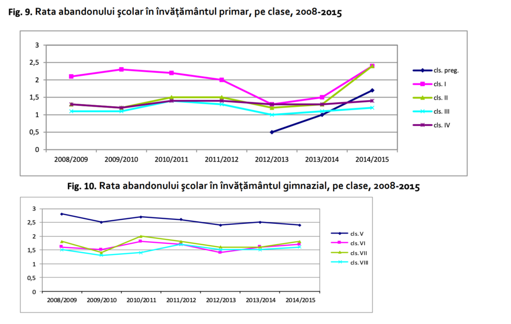În învățământul primar, abandonul şcolar a crescut constant după momentul trecerii la 10 ani obligatorii de școală; în 2014/2015 valoarea indicatorului a înregistrat o creștere semnificativă, de 1,8% (n. red 2014-2015 este anul în care generația pe care o urmărim termina clasa a IV-a), scrie în raport.