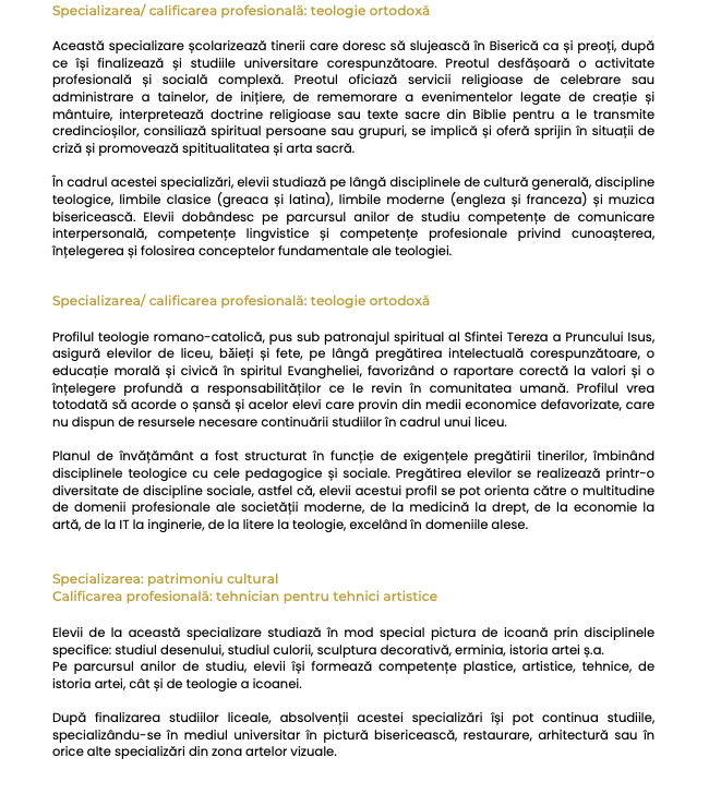 Pentru filiera vocațională, la profilul teologic elevii pot urma trei specializări: