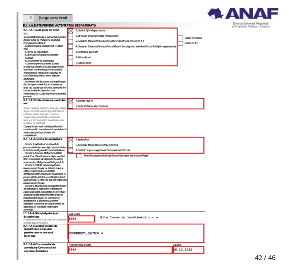 „Trecem la completarea informațiilor referitoare la activitatea desfășurată. Așadar, la categoria de venit se bifează căsuța „activități independente”. În mod automat, aplicația va bifa „sistem real”. Apoi, la forma de organizare se va bifa „individual”, iar la obiectul principal de activitate se va alege, din lista de coduri CAEN, codul CAEN aferent activității de meditații de 8.559.