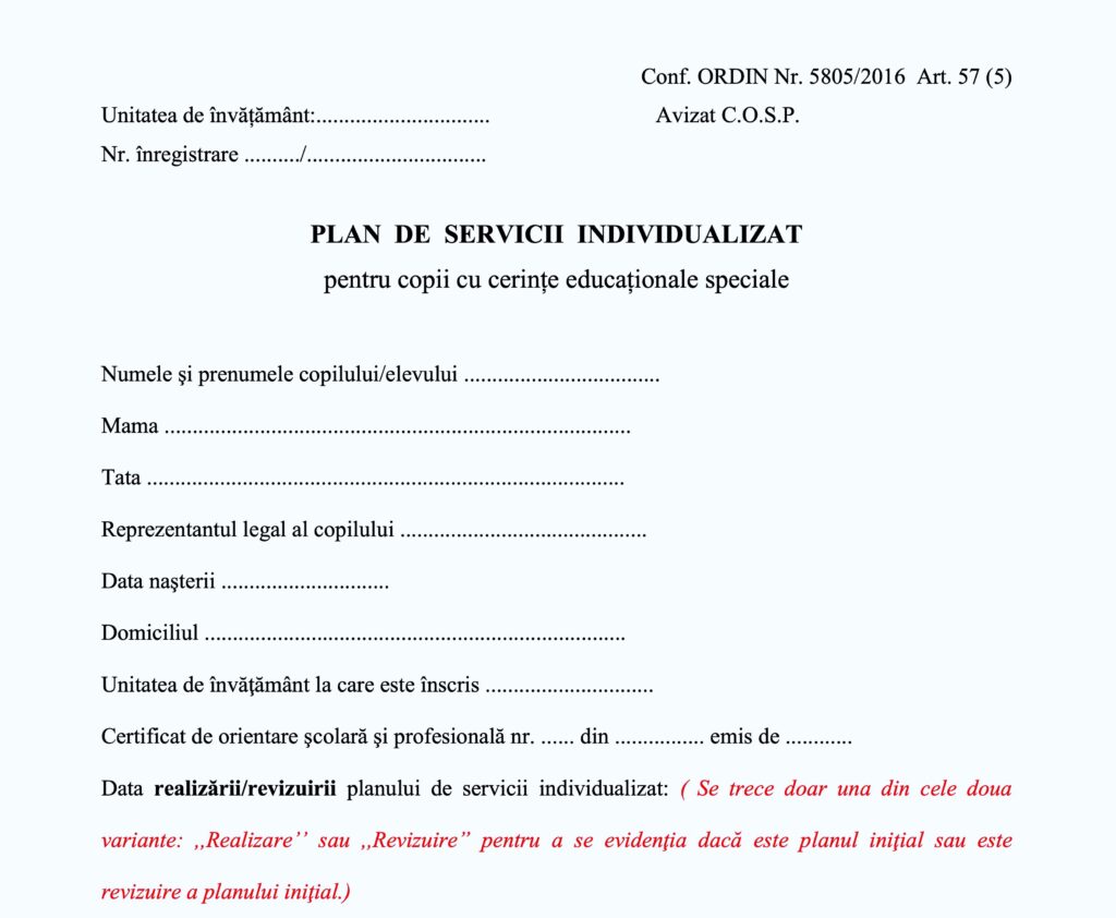 ART. 57 (3) Elaborarea proiectului planului de servicii individualizat se face de către responsabilul de caz servicii psihoeducaţionale, cu consultarea SEOSP, a profesioniştilor care au participat la evaluarea complexă, a părinţilor/reprezentantului legal, precum şi a copilului, în funcţie de gradul său de înţelegere şi adaptat tipului de dizabilitate. Formularul tip al planului de servicii individualizat este prezentat în anexa nr. 15 al Ordinului Nr. 5805/2016 .