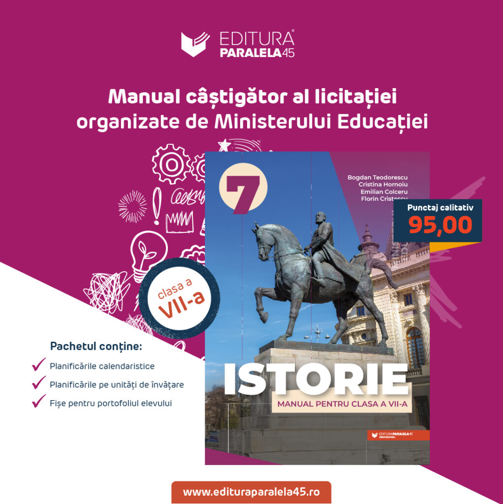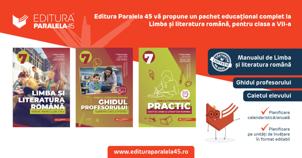 Elevii dumneavoastră merită cele mai bune manuale! Acesta este mottoul care ne ghidează, la Editura Paralela 45, atunci când acceptăm provocarea de a crea, alături de echipe de profesori cu experiență, noi manuale pentru elevii secolului XXI. Vă invităm să aflați mai multe despre cele șase manuale dedicate elevilor de clasa a VII-a de la Editura Paralela 45, manuale care au câștigat licitația organizată în 2024 de Ministerul Educației, cu punctaje cuprinse între 95.00 și 100 de puncte.