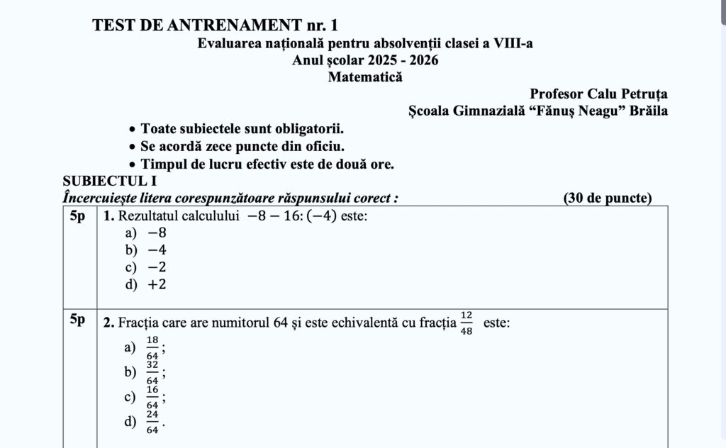 Test de antrenament Limba Română – Evaluare Națională 2026