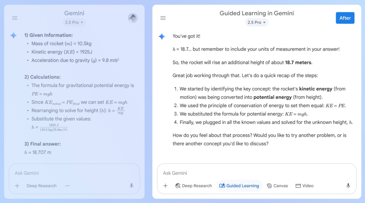 Google a anunțat, miercuri, un modul de învățare asistată, Guided Learning, în cadrul platformei sale de inteligență artificială Gemini, „cu scopul de a ajuta la formarea unei înțelegeri profunde, în loc de a oferi simple răspunsuri”. Inițiativa e anunțată la mai puțin de două săptămâni de când compania OpenAI a anunțat în premieră lansarea unui modul de studiu în cadrul propriului instrument IA, ChatGPT.