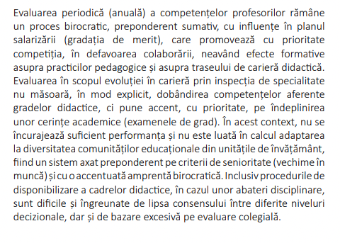 Evaluarea în scopul evoluției în carieră prin inspecția de specialitate nu măsoară, în mod explicit, dobândirea competențelor aferente gradelor didactice, ci pune accent, cu prioritate, pe îndeplinirea unor cerințe academice (examenele de grad). În acest context, nu se încurajează suficient performanța și nu este luată în calcul adaptarea la diversitatea comunităților educaționale din unitățile de învățământ, fiind un sistem axat preponderent pe criterii de senioritate (vechime în muncă) și cu o accentuată amprentă birocratică”.