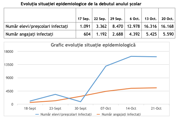 | Număr elevi/preșcolari infectați | 1.091 | 3.362 | 8.470 | 12.978 | 16.316 | 16.168 |