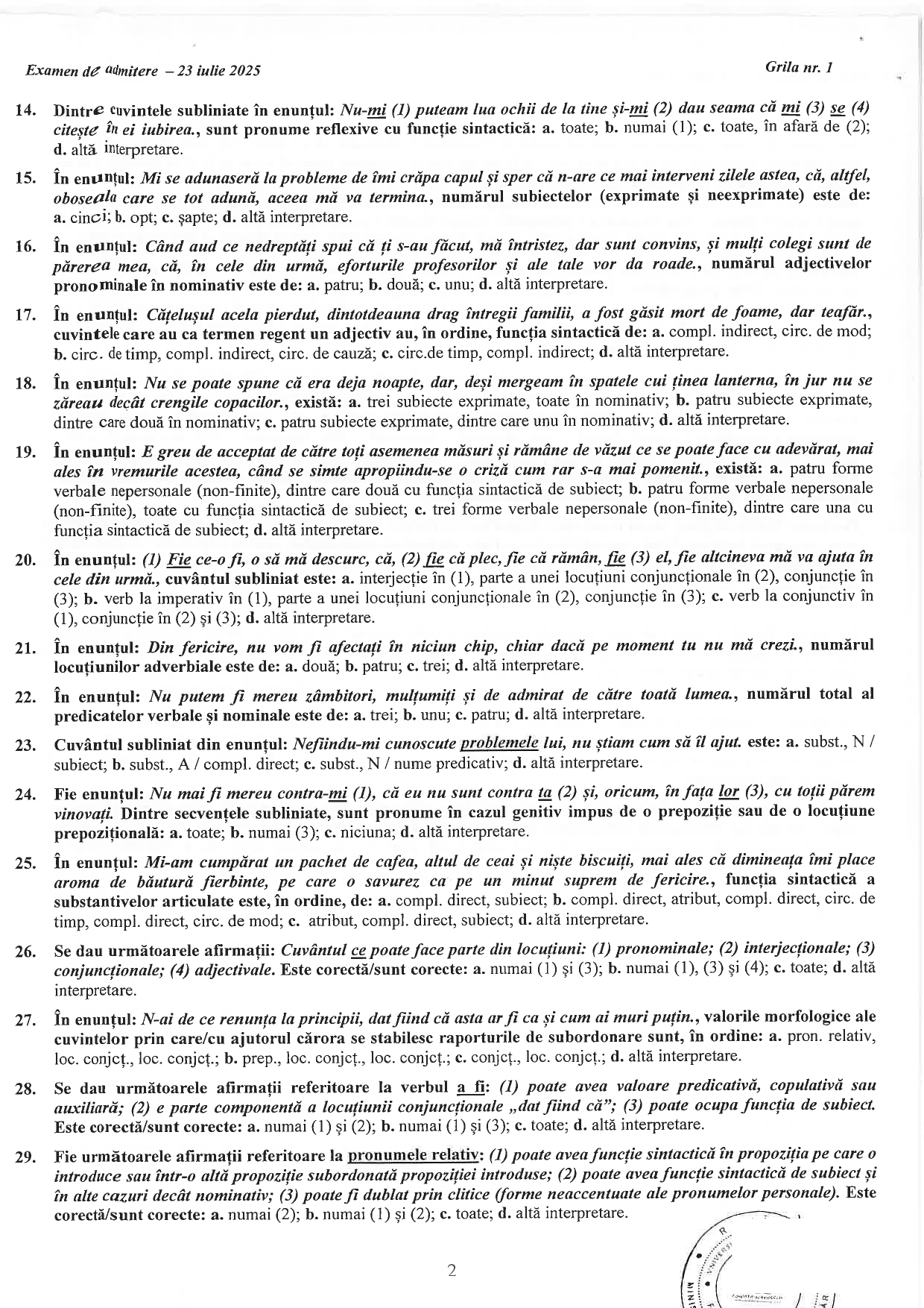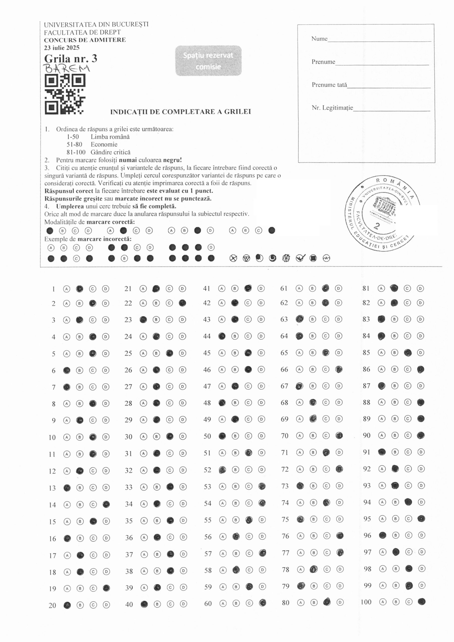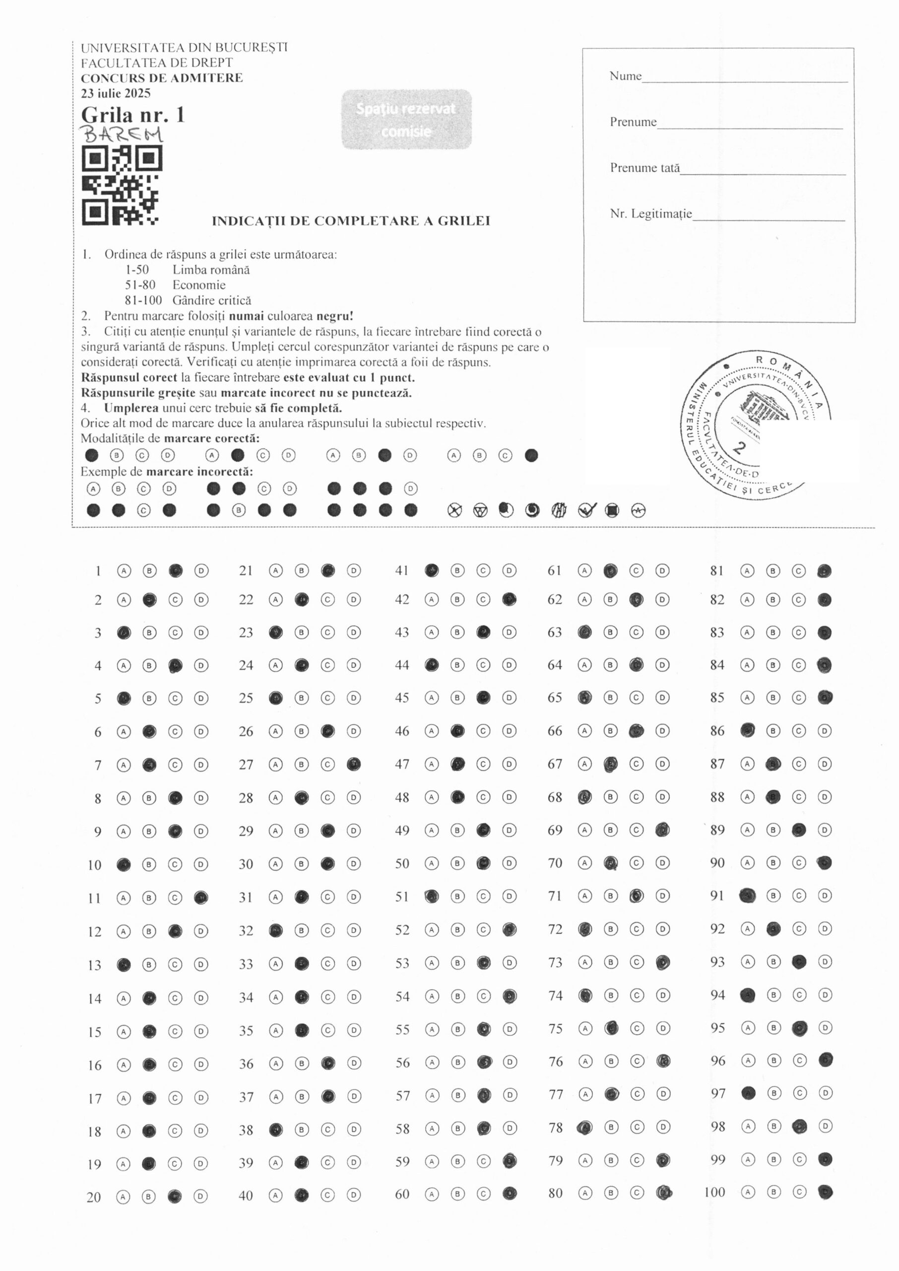 Grilele de la examenul de admitere la Facultatea de Drept a Universității din București (UB), de miercuri, 23 iulie, au fost publicate de organizatori pe site-ul dedicat. Candidații au avut de rezolvat una din cele patru variante de grile date în acest an.
