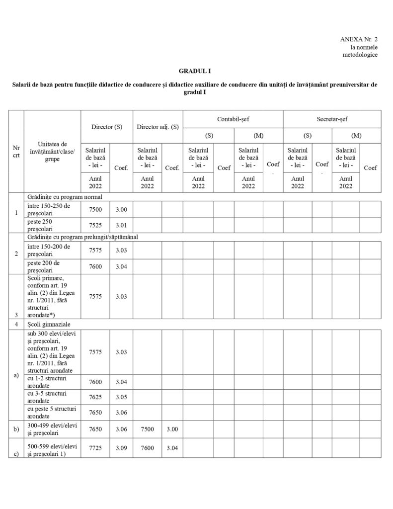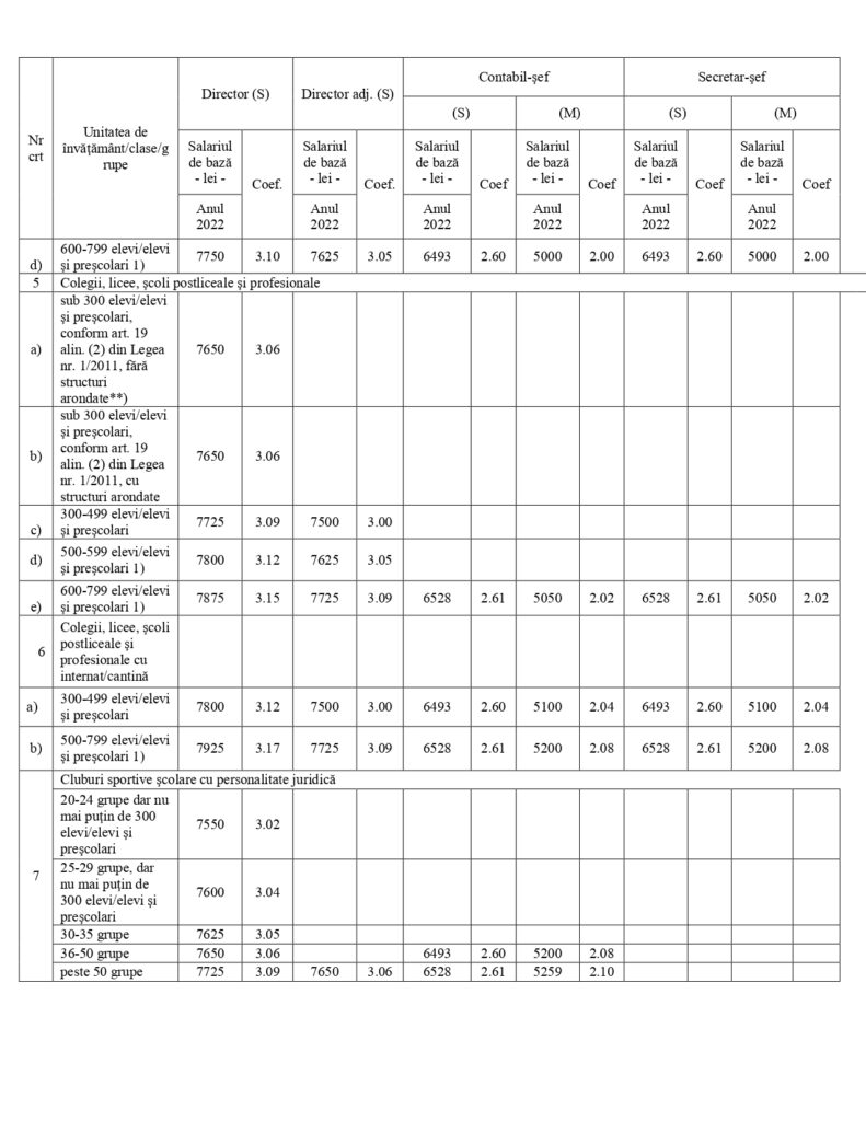 „Prin actualul proiect de act normativ de exemplu, coeficienții pentru funcția de director sunt stabiliți între 3 și 3,35, ceea ce reprezintă o diferență de 0,35 puncte procentuale, respectiv un salariu de bază minim de 7500 lei și un salariu de bază maxim de 8382 lei, diferența între acestea este de 882 lei”, conform notei de fundamentare.