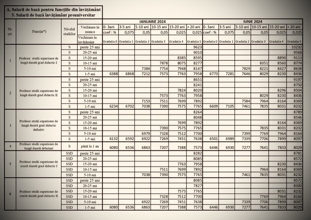 Ministerul Educației a publicat joi seara, după aprobarea în Guvern a ordonanței de urgență cu salariile din învățământ, grila detaliată cu sumele brute în anul 2024.
