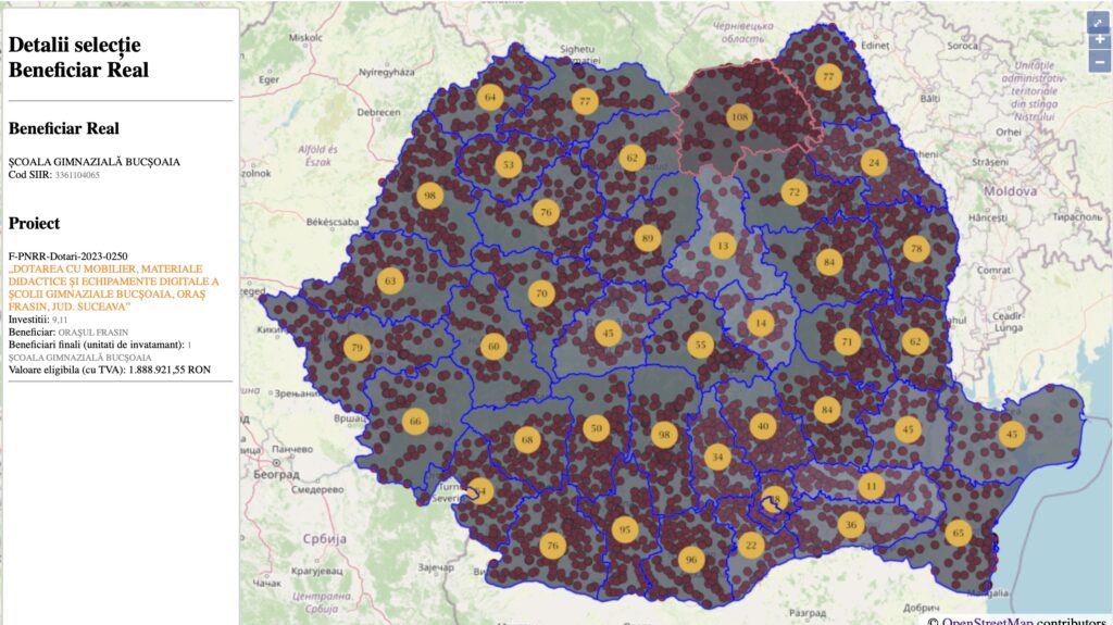 Ministerul Educației a publicat harta interactivă cu cele 2.538 de proiecte prin care școlile vor primi finanțare prin PNRR de peste 1 miliard de euro pentru mobilier, laboratoare de științe, informatică sau cabinete școlare. Pentru fiecare județ se specifică numărul proiectelor depuse, lista școlilor care vor primi finanțare și valoarea proiectului.