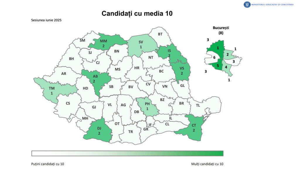 În această sesiune a examenului de Bacalaureat 2025, câte 2 medii de 10 au fost înregistrate în Alba, Maramureș, Iași, Vaslui, Constanța și Dolj.