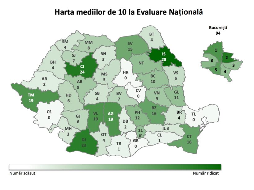 În 2023, județele fără nicio medie de 10 la Evaluarea Națională sunt următoarele: Caraș-Severin, Covasna, Giurgiu, Harghita și Tulcea.