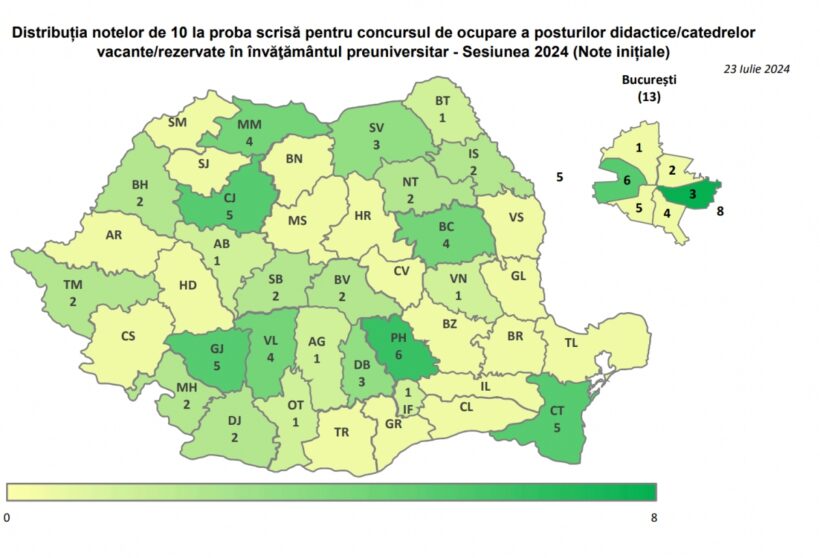 Cele mai multe note de 10 sunt în următoarele județe: București (13), Prahova (6), Cluj (5), Constanța (5), Gorj (5), Bacău (4), Maramureș (4) și Vâlcea (4). Anul trecut au fost 127 note de 10 în toată țara.