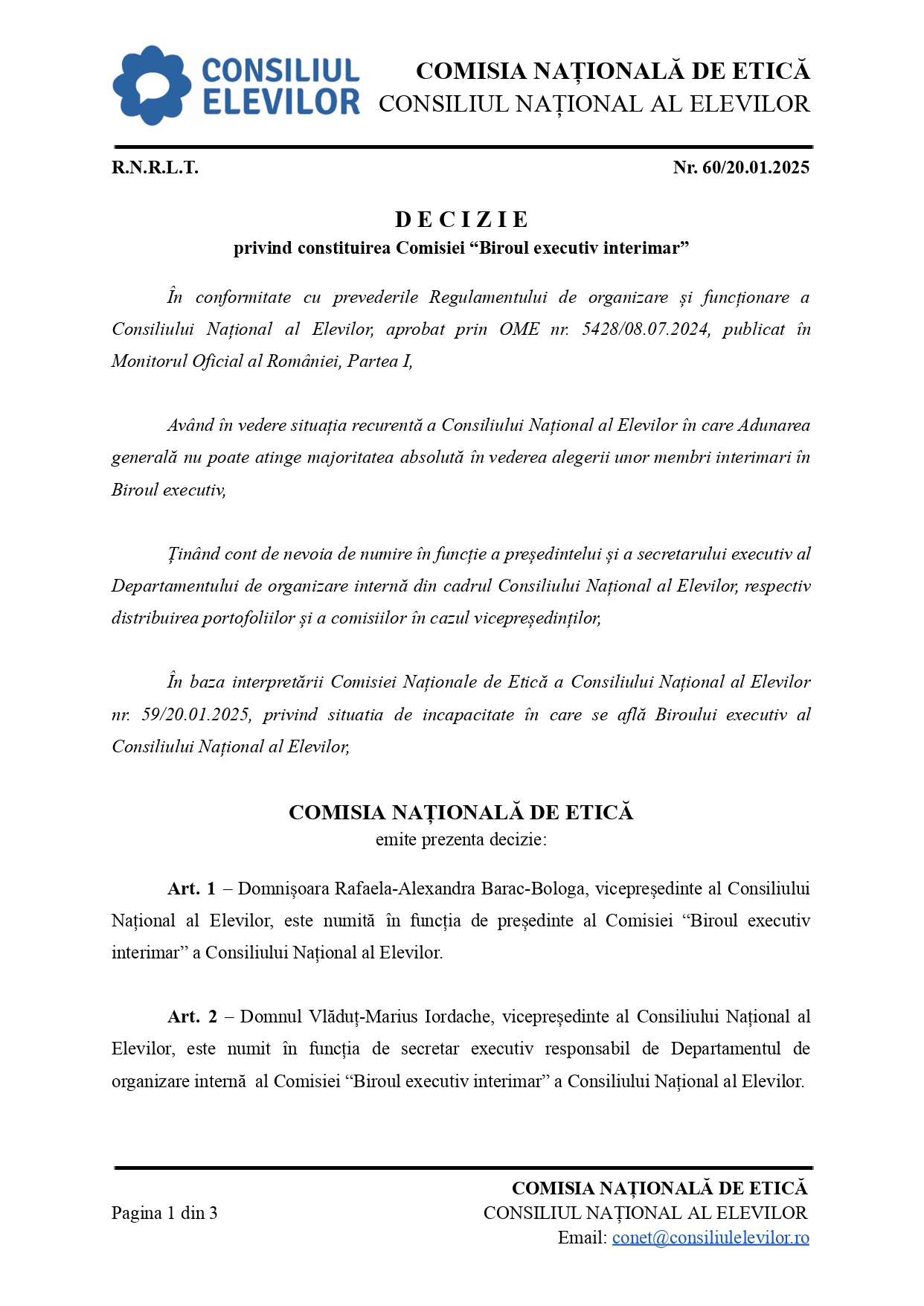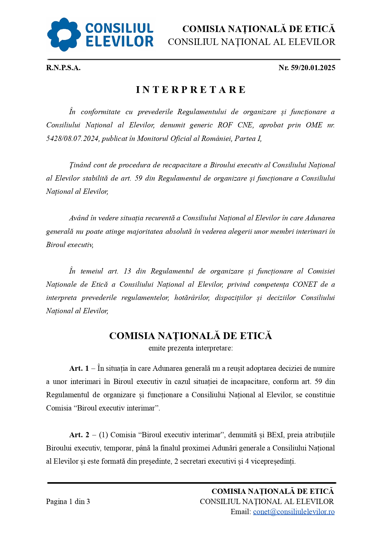 - Articolul 59 – (1) În cazul în care Biroul executiv al Consiliului Național al Elevilor are mai mult de 5 posturi vacante, Adunarea generală a Consiliului Național al Elevilor propune numirea de vicepreședinți interimari din rândul membrilor Adunării generale, decizie ce trebuie adoptată cu majoritate absolută.