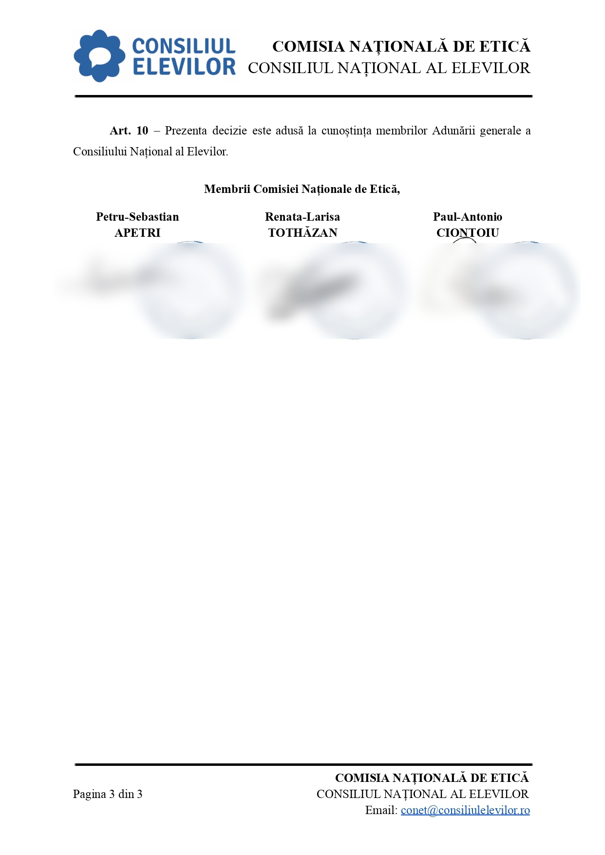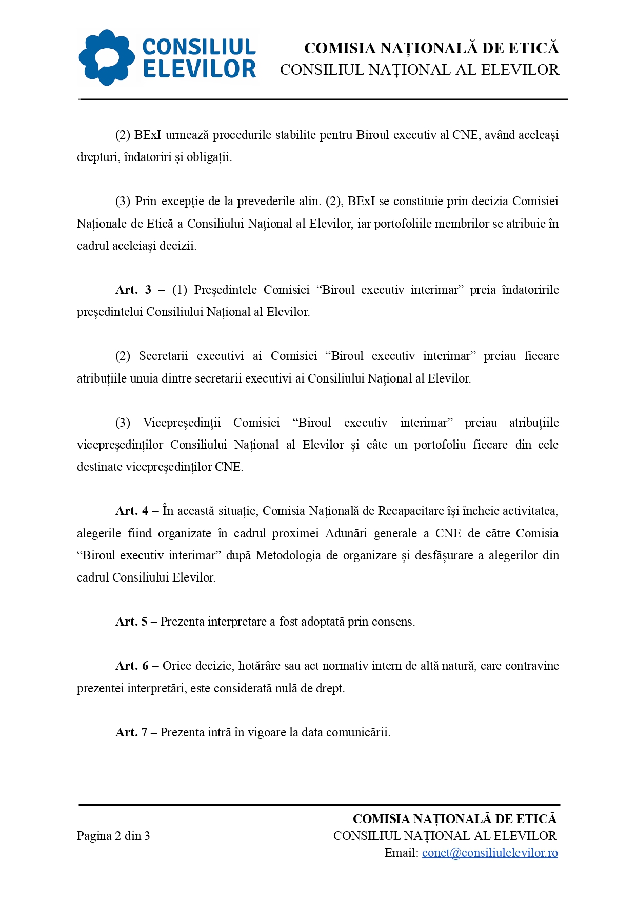 Decizia însă contravine regulamentului de organizare și funcționare al Consiliului Național al Elevilor (CNE) și creează un precedent periculos. Potrivit documentului oficial obținut de Edupedu.ro, Comisia Națională de Etică și-a arogat dreptul de a forma acest organism, deși regulamentul CNE nu conferă astfel de atribuții acestei comisii.