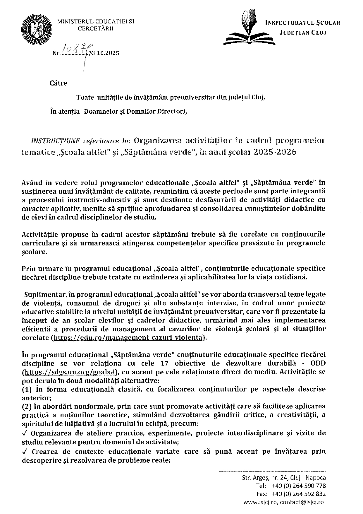 Activităţile care implică costuri din partea părinților sunt interzise în „Școala altfel” și „Săptămâna verde”, potrivit unui document al Inspectoratului Școlar Județean Cluj. Este vorba despre instrucțiunea Inspectoratului Școlar Județean Cluj nr. 10876 din 3.10.2025. Amintim că Programul național „Școala altfel” și Programul „Săptămâna verde” se desfășoară în perioada 8 septembrie 2025 – 3 aprilie 2026, în intervale de câte 5 zile consecutive lucrătoare, a căror planificare o face școala.