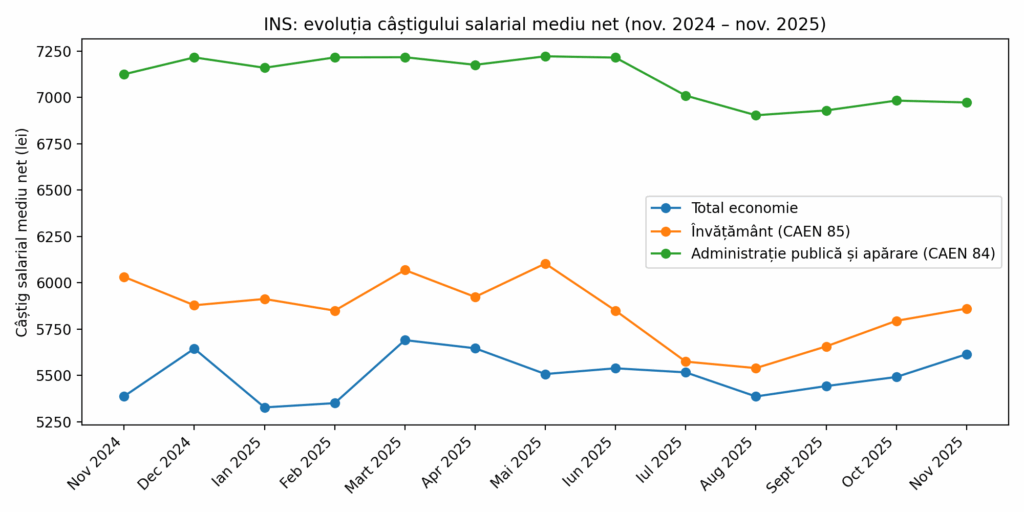 Câștigul mediu net din Învățământ a intrat pe scădere anuală în 2025, în timp ce media pe economie continuă să crească, arată datele publicate vineri de INS. În noiembrie 2025, câștigul salarial mediu net din învățământ a fost de 5.861 lei, față de 6.032 lei în noiembrie 2024, adică o scădere de 171 lei (–2,8%). În același interval, câștigul salarial mediu net pe total economie a urcat de la 5.388 lei la 5.615 lei, o creștere de 227 lei (+4,2%). Rezultatul este un decalaj de aproape 7 puncte procentuale între educație și evoluția generală a salariilor din economie.