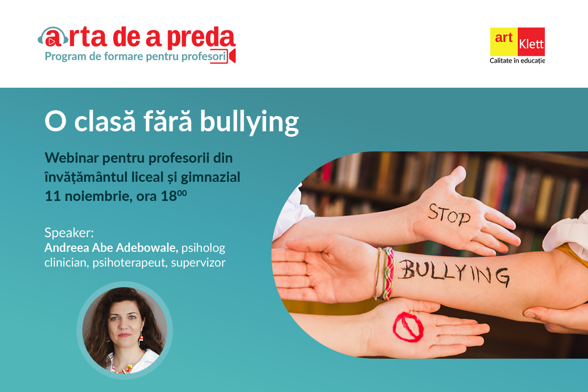 De aceea, vă invităm să luați parte la webinarul „O clasă fără bullying”, susținut de Andreea Abe Adebowale, psiholog clinician, psihoterapeut și supervizor. Evenimentul va avea loc luni, 11 noiembrie, de la ora 18:00, pe platforma Zoom, și este dedicat cadrelor didactice din învățământul liceal și gimnazial, indiferent de locul în care se află.