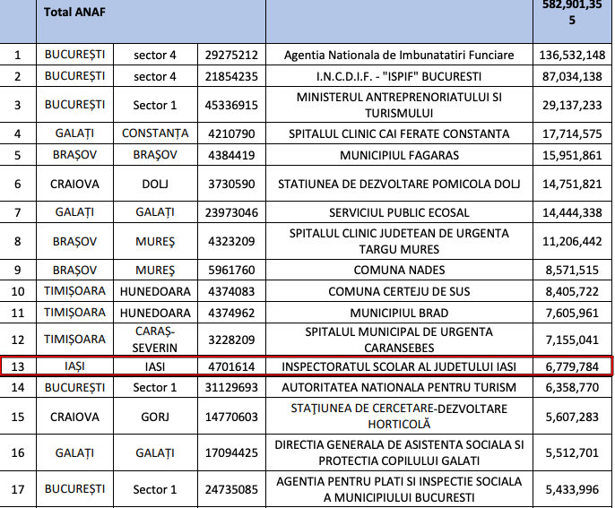 Inspectoratul Școlar Iași are o datorie de aproape 7 milioane de lei la Agenția Națională de Administrare Fiscală (ANAF), potrivit listei cu instituțiile publice care aveau restanțe la data de 31 august 2025, publicată de instituție recent. La solicitarea Edupedu.ro, conducerea Inspectoratului Școlar Județean (ISJ) Iași a transmis că suma restantă datează din perioada 2010-2013 și provine de la cheltuieli neeligibile din anumite proiecte POSDRU, fără să precizeze punctual despre ce proiecte este vorba, dar că sumele „au fost declarate neeligibile la aproximativ 7 ani după finalizarea proiectelor din cauza unor necorelări legislative”. În acea perioadă au fost la șefia ISJ Liliana Romaniuc (octombrie 2009 – Iunie 2012) și Camelia Gavrilă (2012-2017). Edupedu.ro a stat de vorbă cu ambele inspectoare, pentru un punct de vedere.