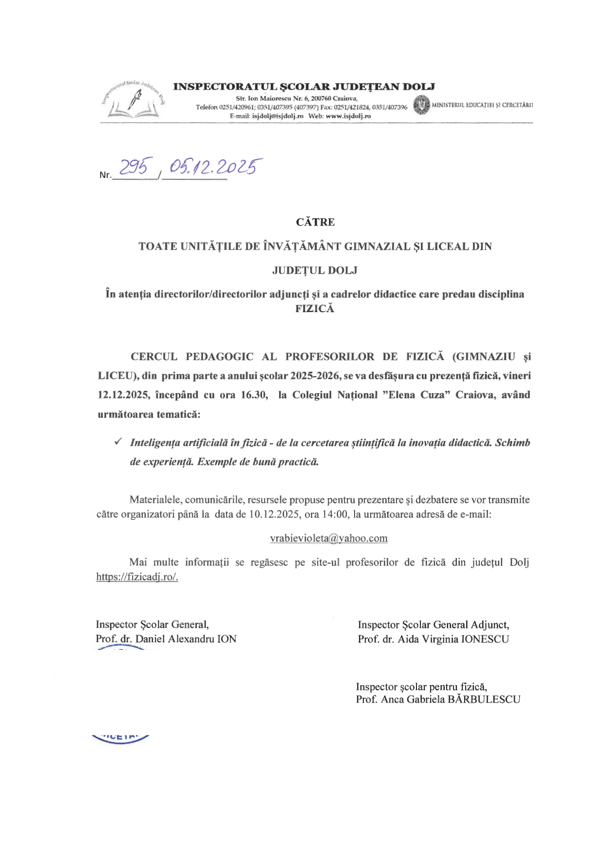„Cercul pedagogic al profesorilor de fizică (gimnaziu și liceu), din prima parte a anului școlar 2025-2026, se va desfășura cu prezență fizică, vineri 12.12.2025, începând cu ora 16:30, la Colegiul Național ”Elena Cuza” Craiova, având următoarea tematică: