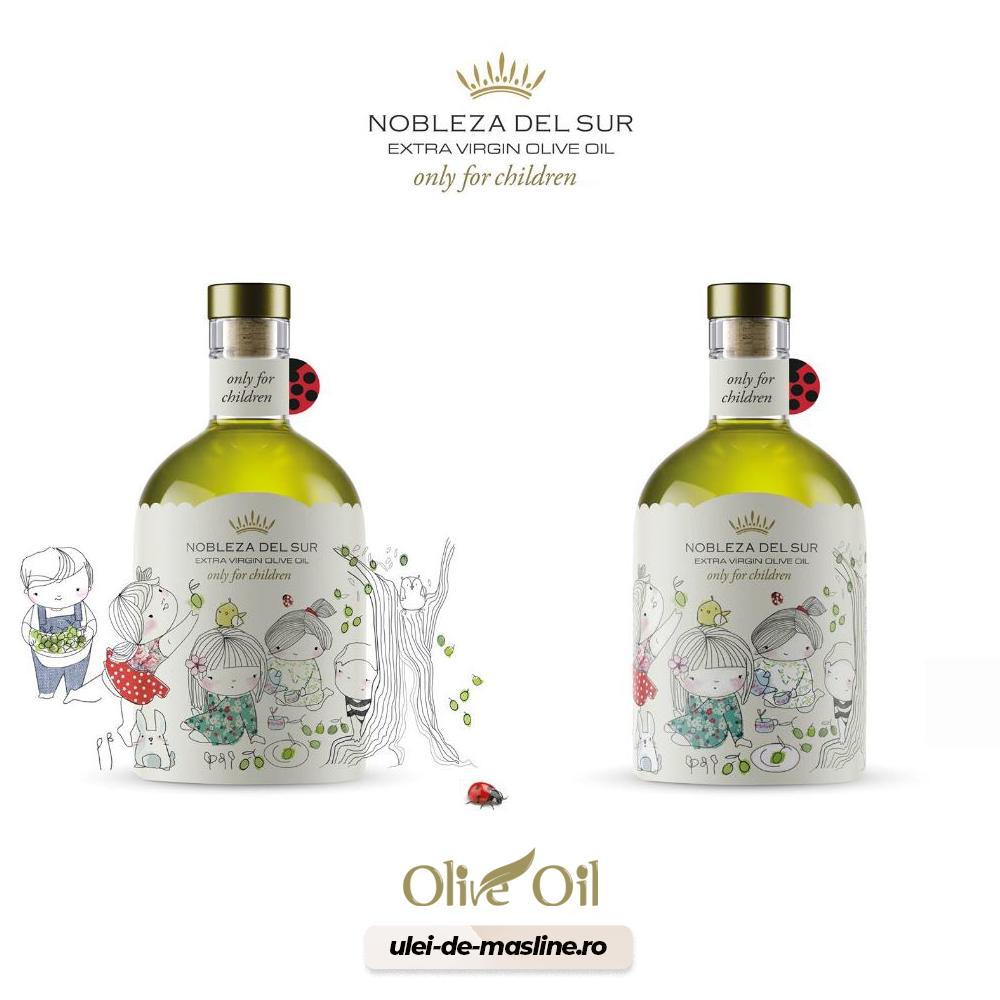 Pentru copii există sortimente dedicate, părinții pot introduce uleiul de măsline în mesele acestora încă de la diversificarea alimentației, spune Alexandra Ghiță, „sunt făcute cu măsline care dau un ulei cu caracteristici de dulce, moale pentru palatul unui copil, cu note de fructe (de exemplu măsline din soiul Arbequina)”.