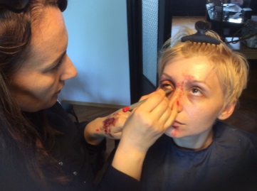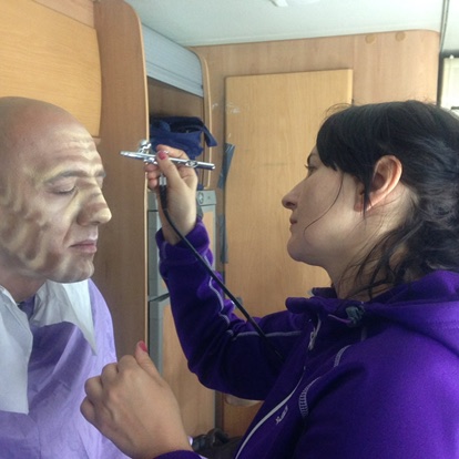 Bianca Boeroiu: Pe orice gen de film. Doar că non-prostetic înseamnă faptul că nu s-au folosit niciun fel de proteze de machiaj, adică părți făcute din diferite materiale, spumă de latex, silicon, tot ceea ce se adaugă la material. De obicei acestea se folosesc pentru răni, cicatrici. Noi, categoria non-prostetic n-am folosit nimic de acest gen. A fost machiaj doar din culori și alte materiale.
