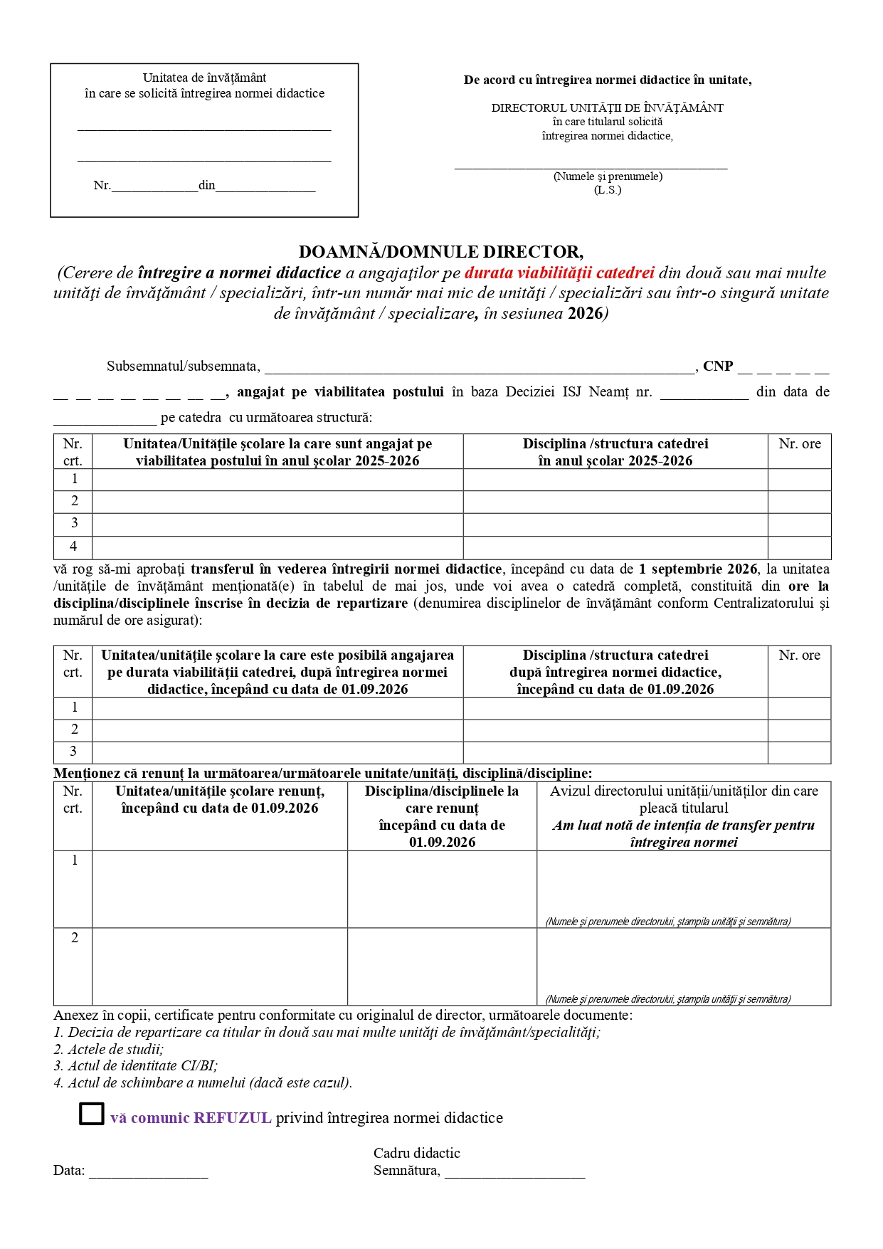Model de cerere de întregire a normei didactice a angajaţilor pe durata viabilităţii catedrei din două sau mai multe unităţi de învăţământ/specializări 2026 – ISJ Neamț