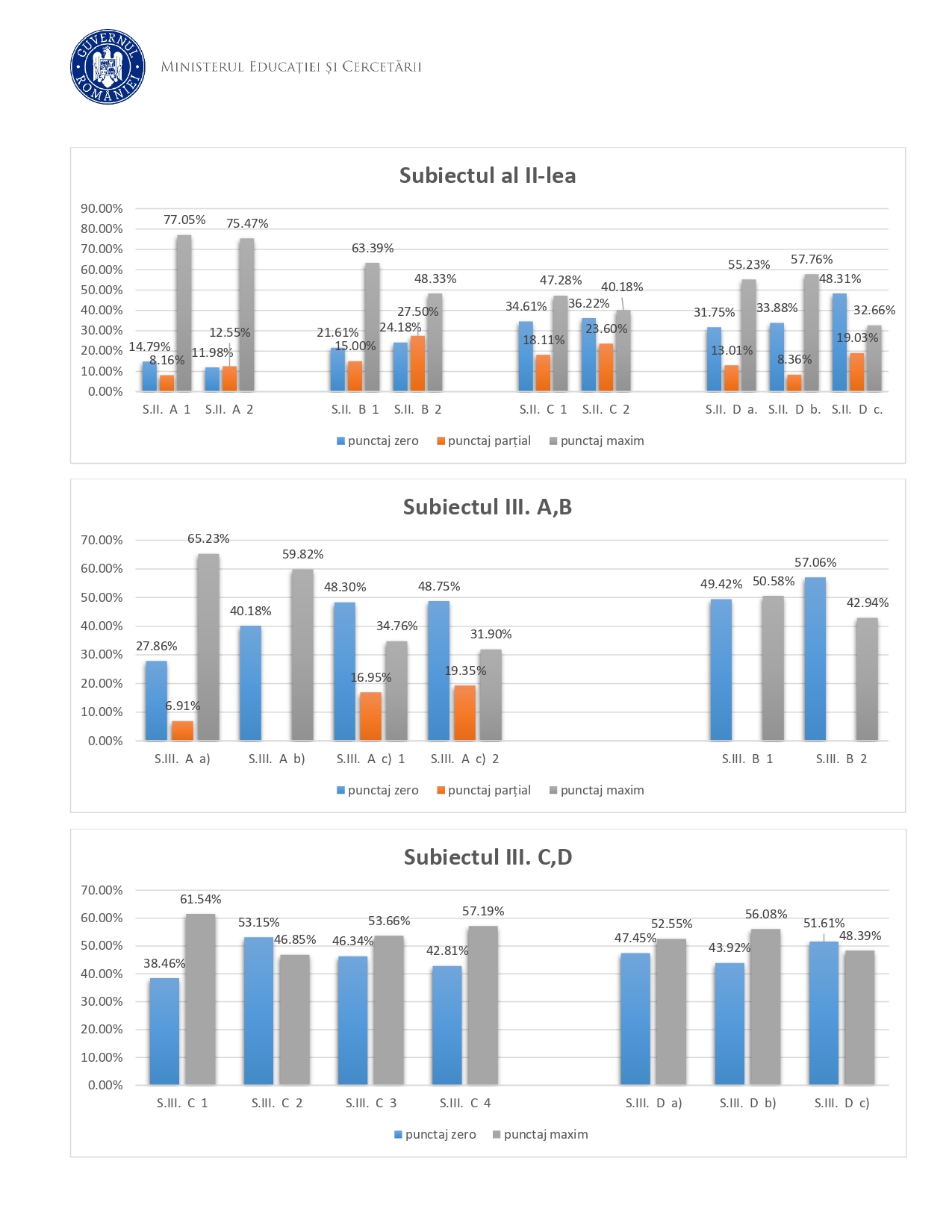 - La sub-itemul f) („Unii E nu sunt A”), doar 67,49% dintre candidați au luat punctaj maxim, în timp ce 32,51% au fost notați cu punctaj zero.