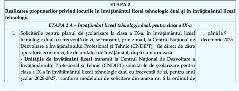 – „Unitățile de învățământ liceal transmit la Centrul Naţional de Dezvoltare a Învăţământului Profesional şi Tehnic (CNDIPT) solicitările de școlarizare pentru clasa a IX-a în învățământul liceal tehnologic dual cu frecvență de zi, pentru anul școlar 2026-2027, conform modelului de solicitare din anexa nr. 6 la ordinul de aprobare a prezentului calendar.