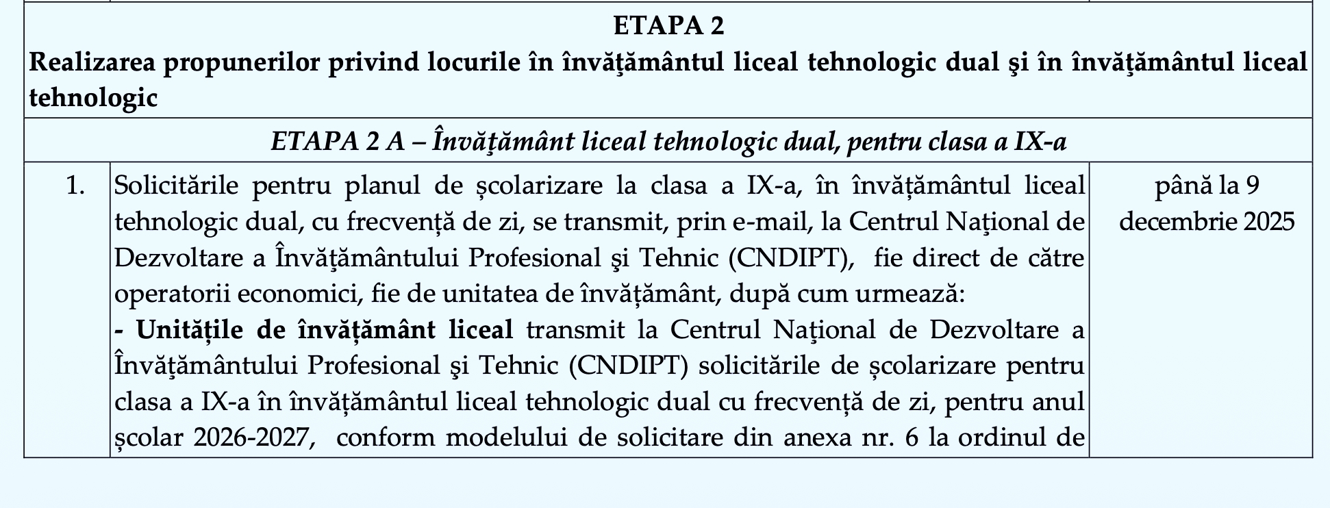– Operatorii economici transmit la Centrul Naţional de Dezvoltare a Învăţământului Profesional şi Tehnic (CNDIPT) solicitările de școlarizare pentru clasa a IX-a în învățământul liceal tehnologic dual cu frecvență de zi, pentru anul școlar 2026-2027, conform modelului de solicitare din anexa nr. 7 la ordinul de aprobare a prezentului calendar.