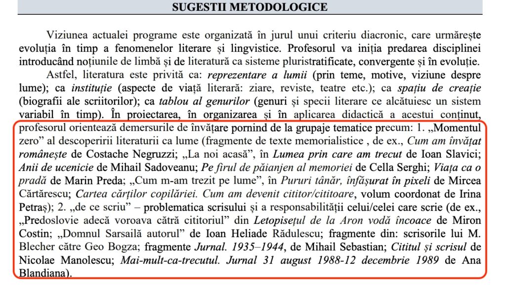 Noua programă școlară pentru limba și literatura română, pusă în dezbatere publică de Ministerul Educației pe 25 noiembrie 2025, conține recomandări de autori precum cronicarul Miron Costin cu „Letopisețul de la Aron Vodă încoace”, Costache Negruzzi, Ioan Slavici, Marin Preda sau Mihail Sadoveanu, cu referire la criterii diacronice (n. red care urmăresc în timp evoluția fenomenelor literare). Mircea Cărtărescu și Ana Blandiana sunt singurii autori români contemporani menționați în noua programă de-a IX-a în recomandările pentru profesori. Vezi la finalul articolului și ce autori au dispărut din actuala programă.