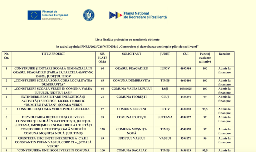 A fost publicată lista finală cu proiectele de școli verzi care ar trebui să primească finanțare prin apelul „Construirea și dezvoltarea unei rețele-pilot de școli verzi”, prin PNRR.