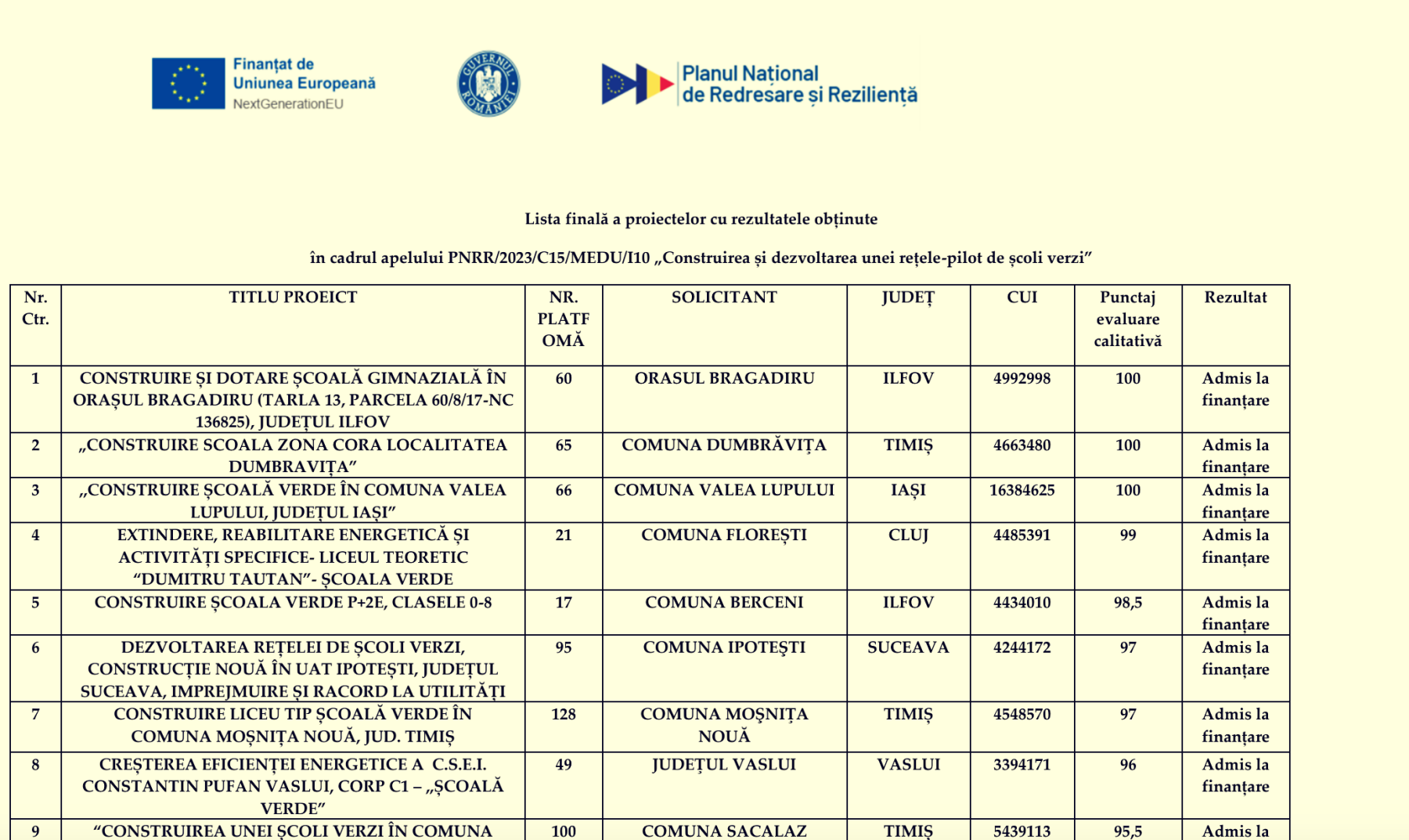 Lista finală cu proiectele eligibile pentru a primi bani pentru apelul Construirea și dezvoltarea unei rețele-pilot de școli verzi