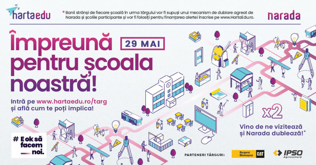Pe 29 mai, în cadrul târgurilor organizate în fiecare școală, unitățile de învățământ mobilizează comunitățile pentru a participa și a cumpăra produsele puse în vânzare. Banii adunați vor fi și de această data supuși unui mecanism de dublare, susținut de partenerii Narada, Bergerat Monnoyeur și Ipso Agricultură, și vor fi folosiți pentru finanțarea unor alerte de tipul schimbarea pardoselii și a acoperișului într-o școală, instalarea unui sistem de securitate, reabilitatea instalației electrice, construirea unui teren de sport sau a unor spații de învățare și de joacă pentru copii.