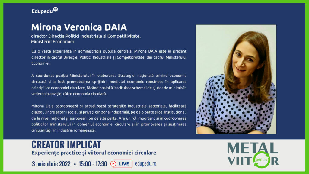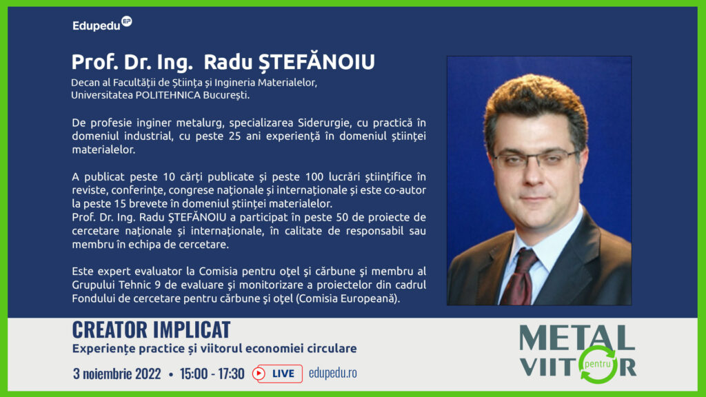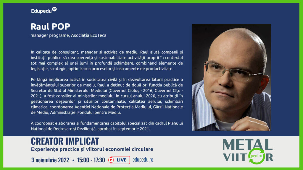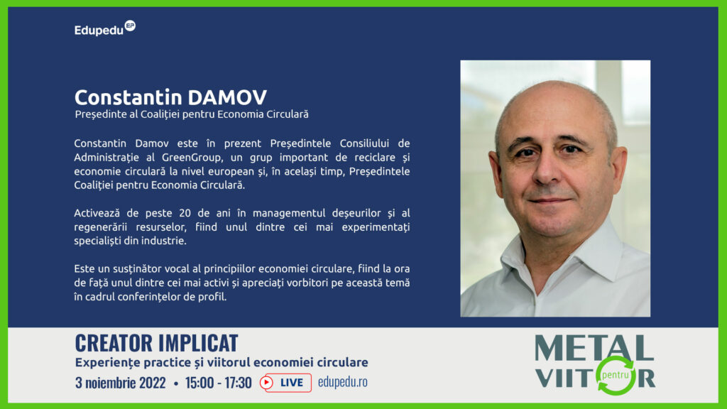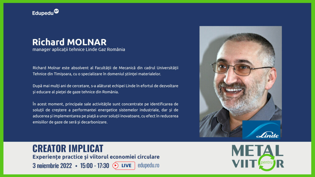 În acest context și vă invităm joi, 3 noiembrie 2022, la conferința online “Creator implicat – experiențe practice și viitorul economiei circulare” organizată de Edupedu.ro, în parteneriat cu As Metal, GreenPoint Management, Linde Gaz România și agenția WebEfektiv. În cadrul evenimentului vom lansa și campania „Metal pentru Viitor”.