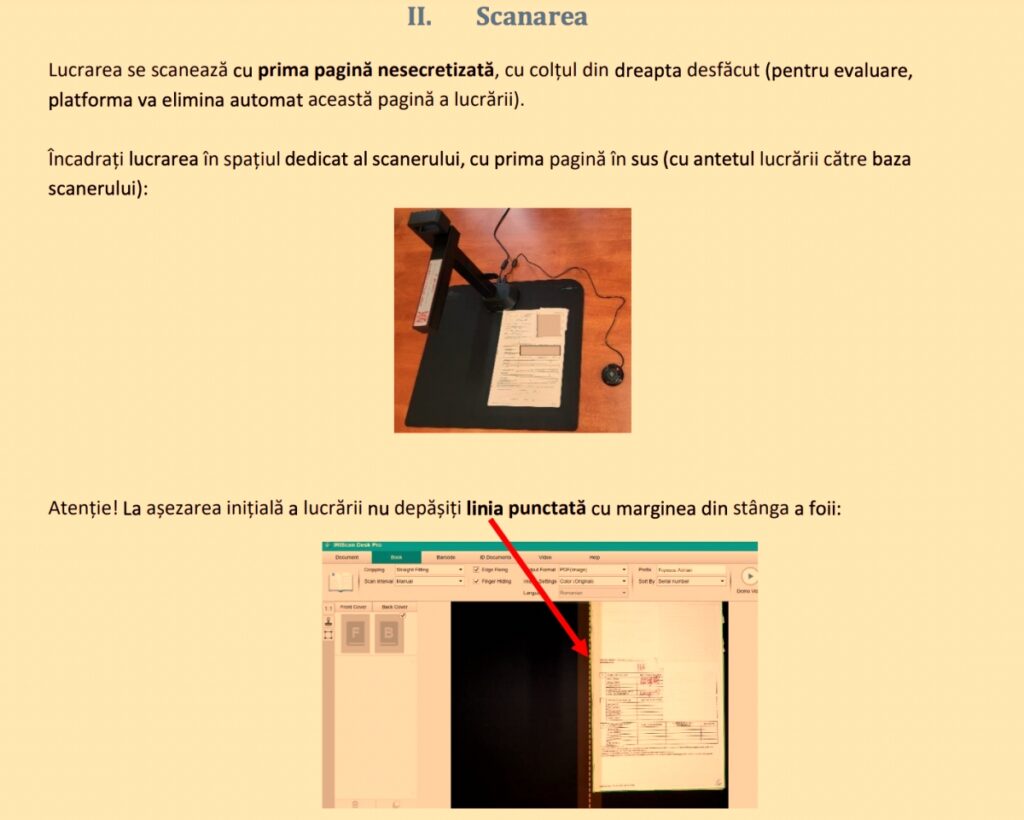 „Lucrările vor fi scanate ca o carte sau broșură. Aplicația scanează câte două pagini, astfel încât vor rezulta: o pagină neagră în stânga primei pagini a lucrării, respectiv o pagină neagră în dreapta ultimei pagini. Începeți cu lucrarea închisă, după care deschideți și scanați în ordine toate paginile.