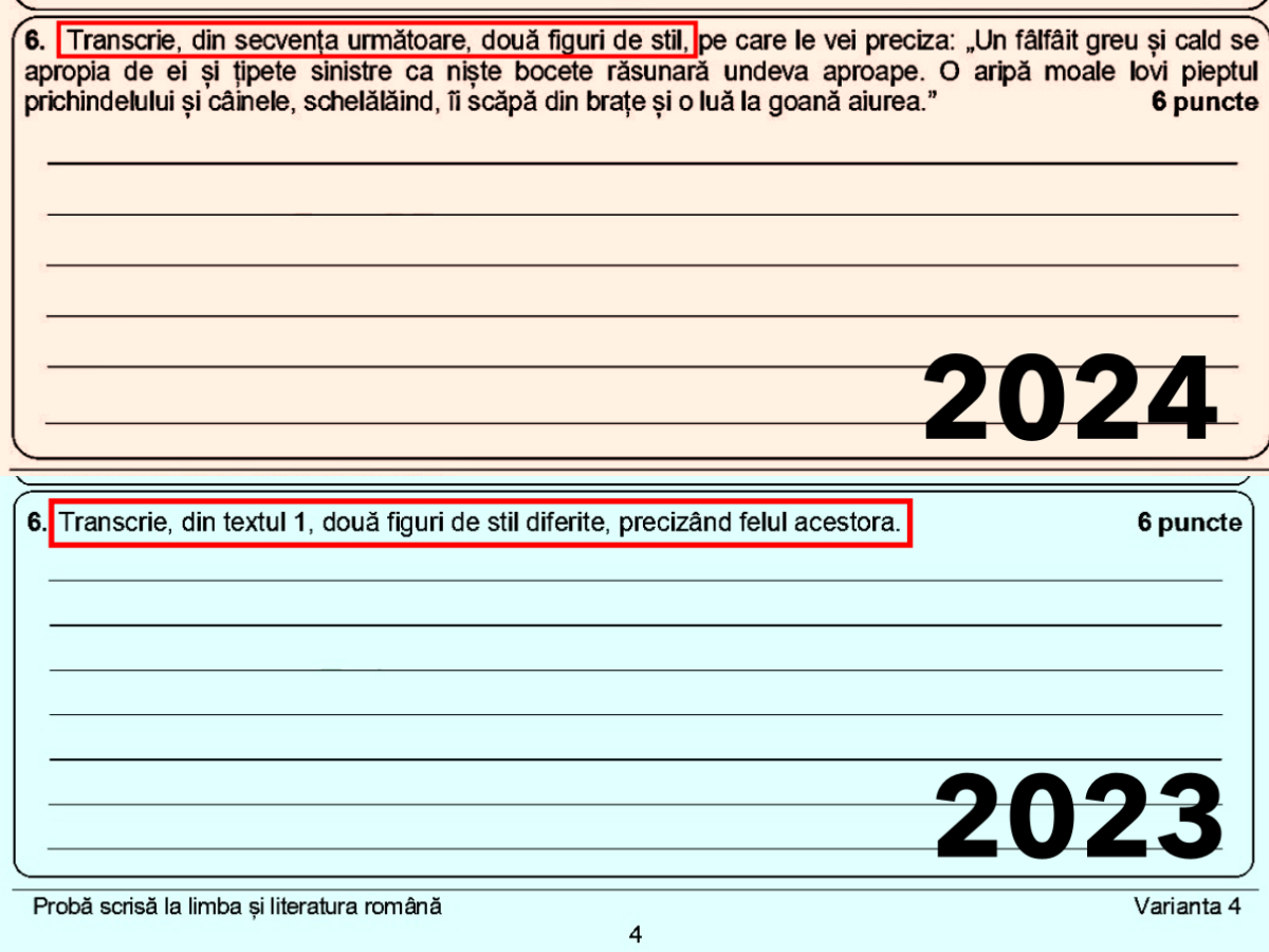 Similar este itemul următor – itemul 6, chiar mai ușor decât anul trecut. În 2024, elevii au avut de transcris din textul suport două figuri de stil și să precizeze de care fel sunt, iar în 2023 – două figuri de stil, dar diferite, precizând de asemenea tipul lor.