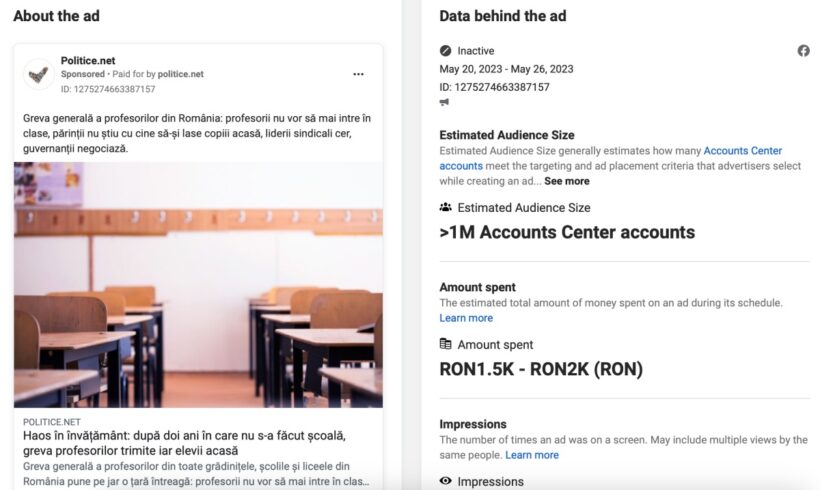 Trei pagini de Facebook neasumate public, dar care au fost folosite în trecut în campanii politice, au plătit la finalul lunii mai postări sponsorizate cu conținut negativ la adresa profesorilor intrați în grevă, dar și a unuia dintre liderii sindicatelor din învățământ, potrivit unei anchete Misreport. Potrivit sursei citate, cele trei pagini – Salvăm România, guvernare.net și politice.net – au vizat prin postările lor, ce folosesc conținut tipic materialelor de dezinformare, un public de 3 milioane de utilizatori de Facebook.