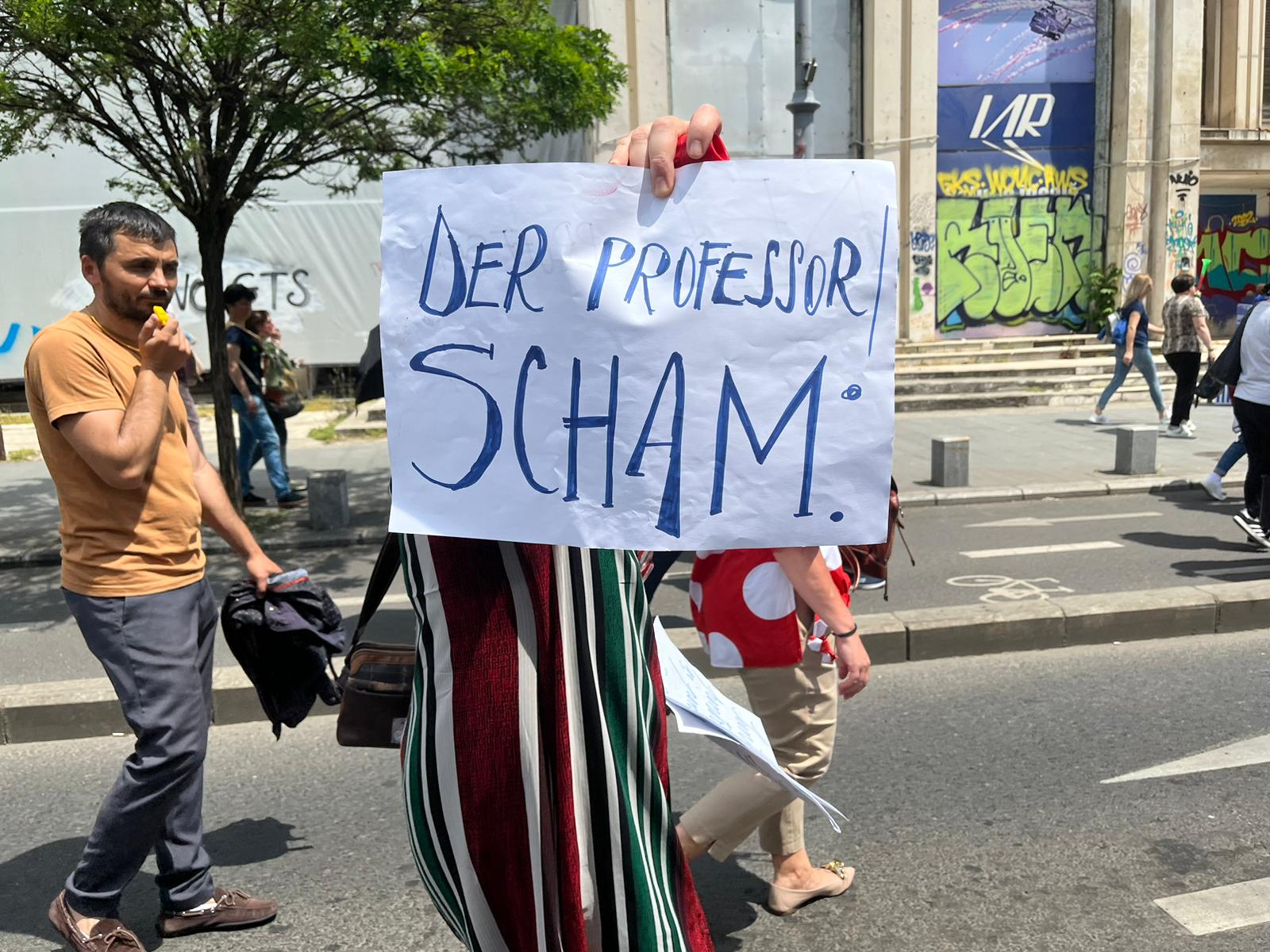 “Scham!” (“Rușine” în limba germană) este unul dintre mesajele purtate la mitingul profesorilor de joi. Îl poartă o profesoară care spune că predă la Liceul Miguel de Cervantes și care explică pentru Edupedu.ro că aceasta este ceea ce dorește s-i transmită președintelui Klaus Iohannis “în limba lui maternă, poate în felul acesta înțelege”.